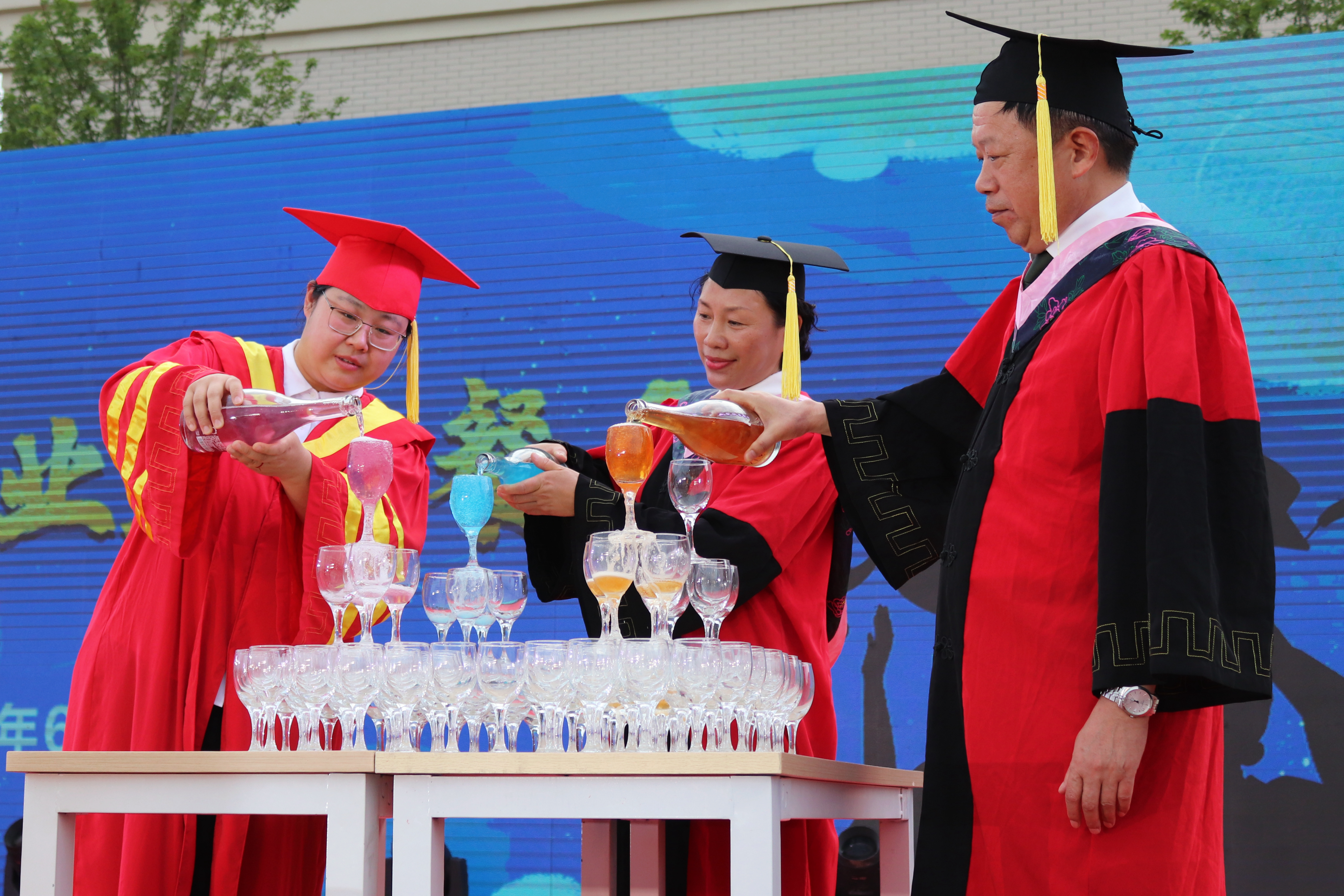 丁锋董事与陆博校长、金鑫书记共同斟满香槟塔,与学子们开怀畅饮,共叙师生情谊。