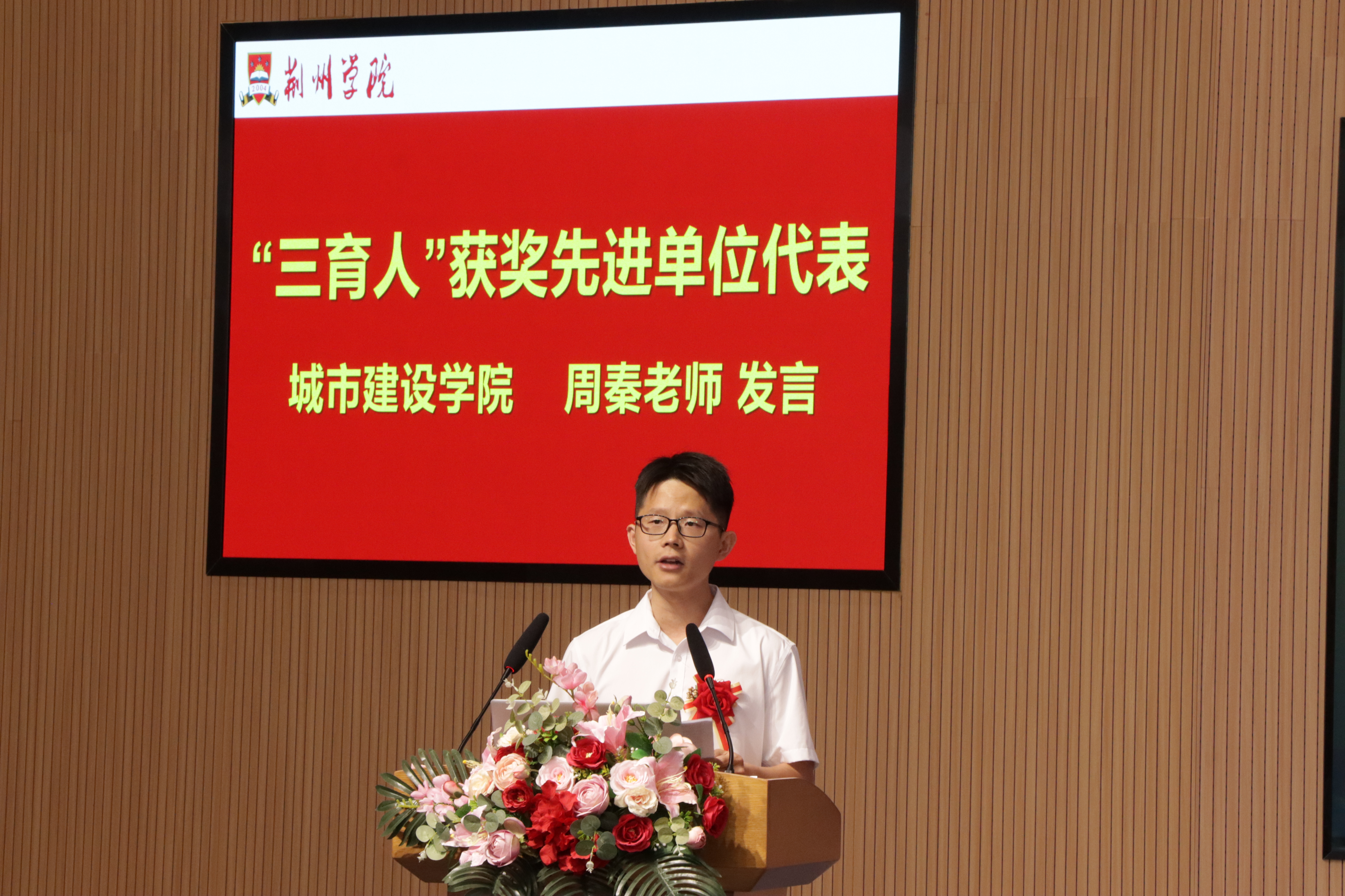 教育学院院长魏春霞作为先进单位代表、城市建设学院专任教师周秦作为先进个人代表先后发言,分享了他们在教书育人中的经验与感悟,展现了荆院人立足岗位、追求卓越的精神风貌。
