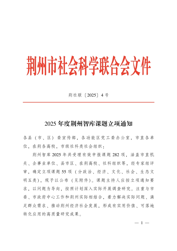 【喜讯】我校获批2025年度荆州智库课题立项
