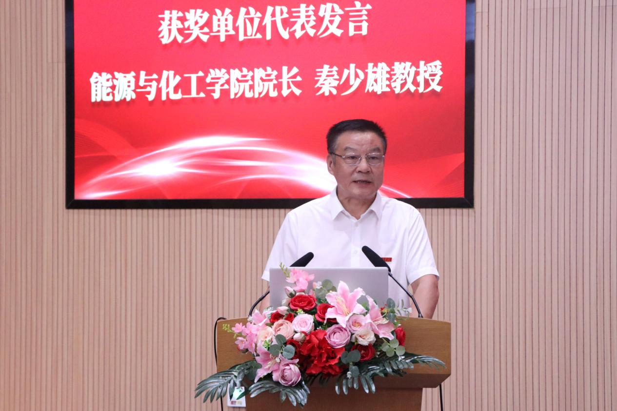 获奖单位代表能源与化工学院院长秦少雄博士上台发言,他以团队的工作内容为切入点,表示这份荣誉属于全体默默耕耘的老师,这份荣誉将激励全体成员以更高标准履行职责,凝聚团队力量,全面提升人才培养质量,为学校发展贡献力量。