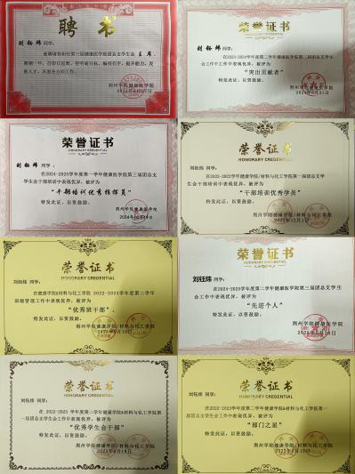 工作上:担任护理学2202班团支部书记,曾与班委带领班级荣获“优秀班级”“五四红旗团支部”,积极响应团委号召,荣获“优秀班干部”、“优秀共青团干部”等荣誉;作为团总支学生会组织部部长,认真负责,井然有序的努力完成每一项工作任务,在五四表彰中配合老师和其他学生干部成功通过答辩使团总支被评为“五四红旗团总支”,在职期间,配合老师管理好团建工作,先后完成了学院毕业生团员学社衔接、团情调查、团费缴纳、入党积极分子推优、五四表彰工作、新团员的发展及智慧团建系统管理。作为团总支学生会主席响应党组织、校团委的号召,组织开展“荆院健康行”系列文体、教育活动,荣获学生工作“部门之星”、“优秀学生会干部”、“突出贡献者”、“先进个人”等荣誉。