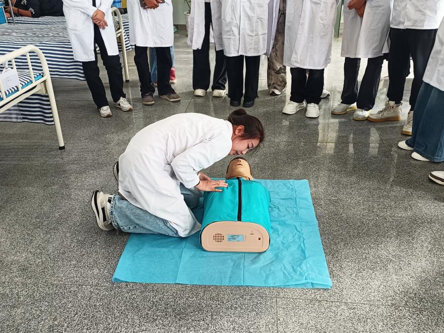 医务人员讲解演示后,同学们主动“上阵”,在专业指导下实操演练心肺复苏术。“在做心肺复苏的时候,姿势一定要准确,上身直立,双手臂伸直与地面垂直,双手指相扣……”医护人员带着专业医用教学设备,指导学生进行模拟心肺复苏的实践操作。通过这种手把手的指导方式,同学们能够更加直观地感受到心肺复苏的过程,增强了应对紧急情况的信心和能力。