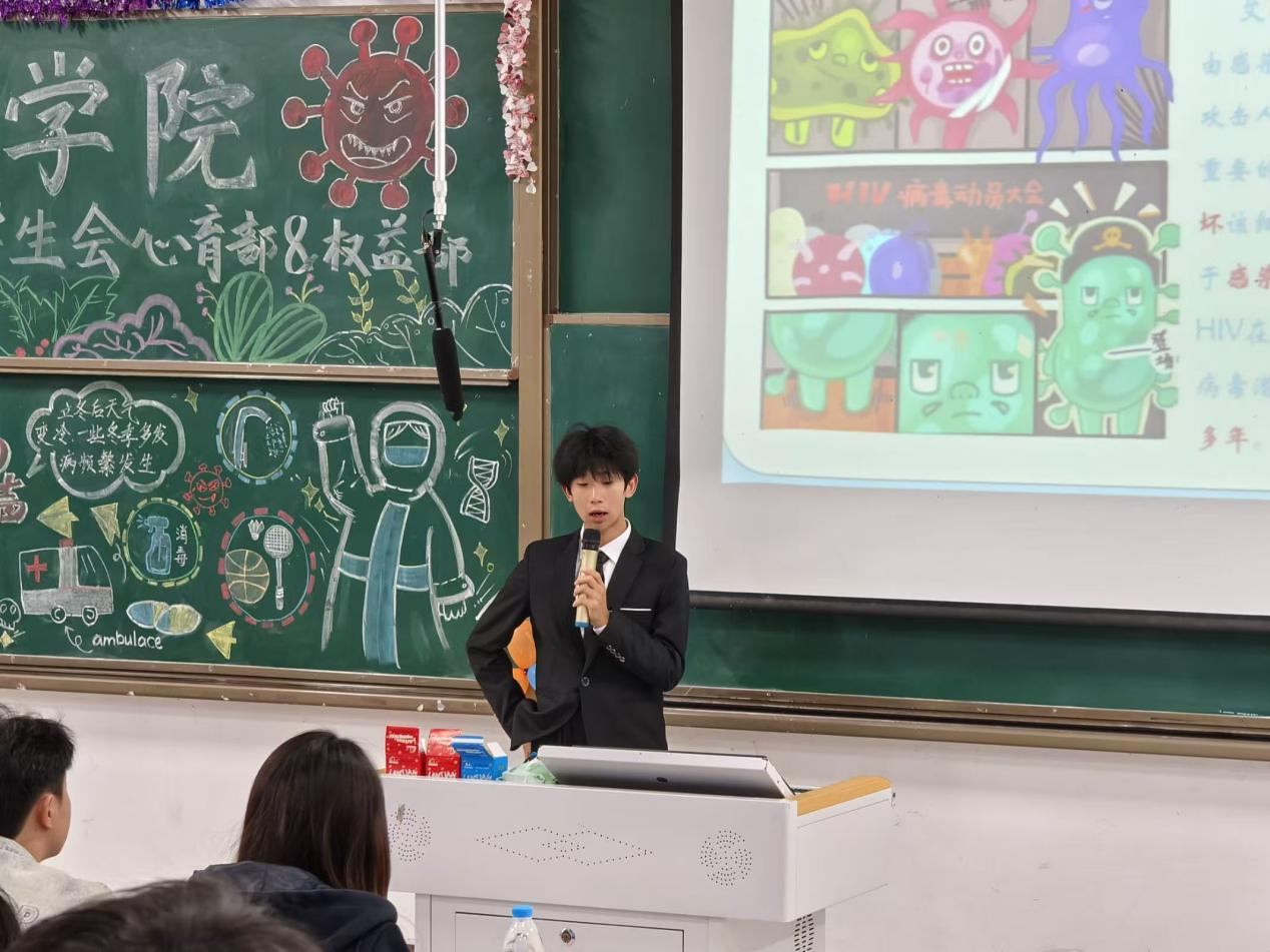本网讯(通讯员:李潞)为了进一步提高同学们对艾滋病的认识与理解,扎实推进防“艾”知识进高校,增强同学们的自我保护意识和防护能力,营造健康向上的校园生活。10月27日晚上,健康医学院在3105教室隆重举办“以爱为名,为“艾”发声”主题知识讲座活动。此次活动由心育部干事牛嘉文主持,心育部干事蔡雨轩、权益部干事陈思源主讲。