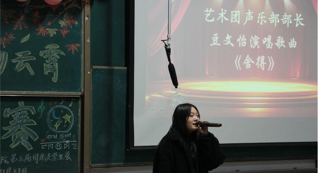 歌声从这里传递,音符从这里飘扬,青春从这里激荡,梦想从这里起航。一场充满青春活力与激情的音乐盛宴正式开始,校艺术团声乐部部长豆文怡带来的暖场歌曲《舍得》,文体部詹恋、王彩蝶学姐带来的舞蹈《Heat lack》,瞬间点燃了整个赛场的激情,气氛急剧升温至高潮。