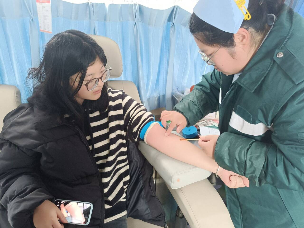 在无偿献血环节,均有专业医护人员进行操作,环境安全且无菌。并且,医护人员在献血过程中会时刻留意献血者的身体状况,同时向其耐心嘱咐后续注意事项。完成献血后,医护人员还会让献血者在献血车内观察十五分钟后确认无特殊情况后再让献血者离去。