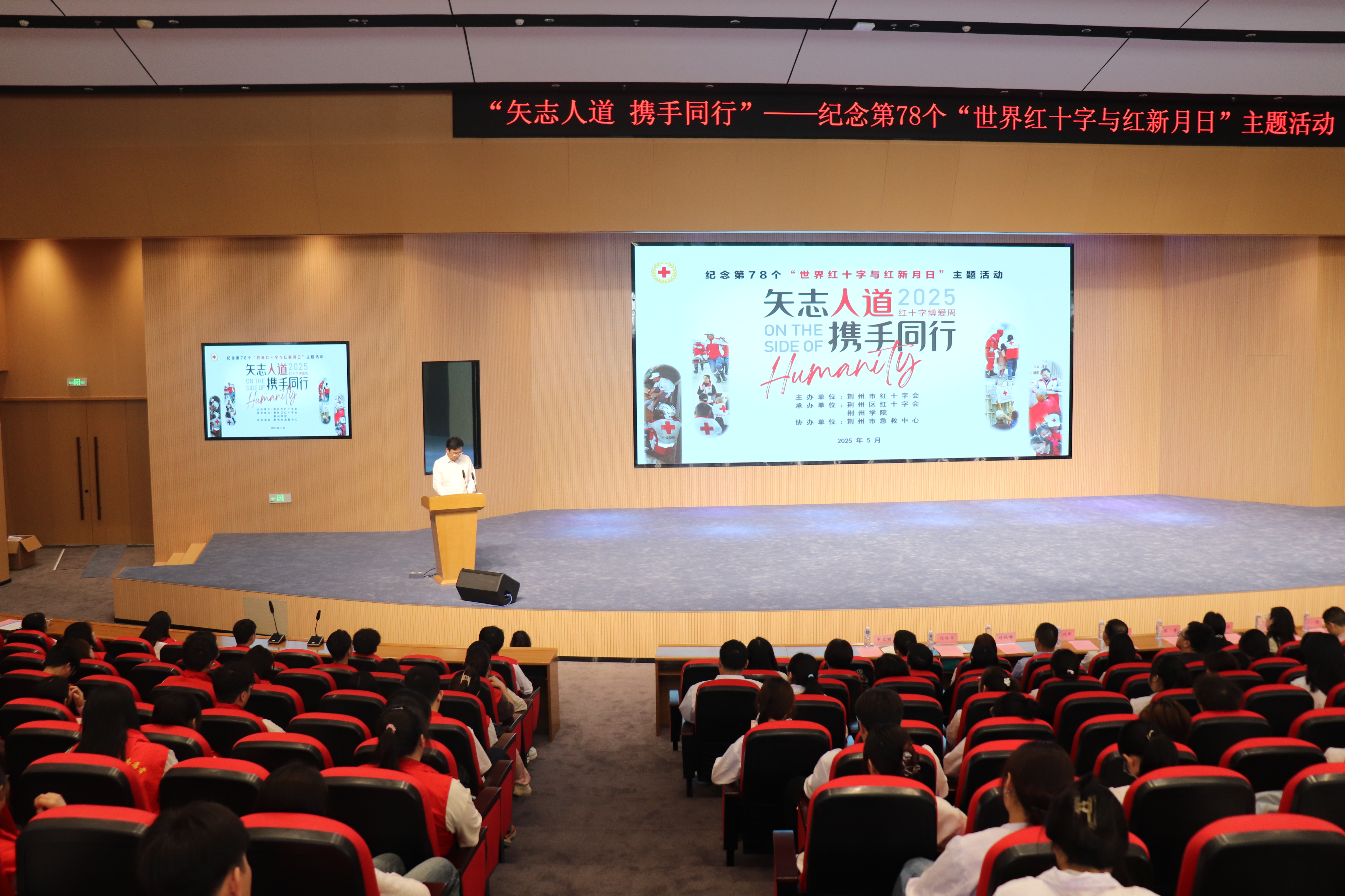 本网讯(通讯员 梁威怡)为纪念第78个“世界红十字与红新月日”,弘扬“人道、博爱、奉献”精神,5月9日,我校与荆州区红十字会共同举办“红十字博爱周”主题活动。荆州区人民政府副区长、荆州区红十字会会长关勇,荆州区红十字会党组书记、常务副会长张芳,荆州区红十字会党组成员、专职副监事长向贝莅临学校活动现场,我校党委书记张晓彬,副校长付秋峰、刘瑾,以及职能部门负责人、师生代表500余人共同参加了公益活动。本次活动由刘瑾主持。
