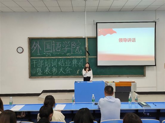 本网讯(通讯员 邹静依)奋斗彰显青春底色,赤忱建功伟大时代。外国语学院在5月5日晚上6点半于5405教室召开干部培训结业典礼暨表彰大会,旨在表彰先进、树立典型、提质增效。副校长付秋峰,外国语学院党总支书记莫修梅、团总支书记何龙、学生党支部书记蔡念,辅导员辛琦、陈晓倩等领导和老师莅临现场,全体学生干部参会。本次会议由学生会主席曾静主持。