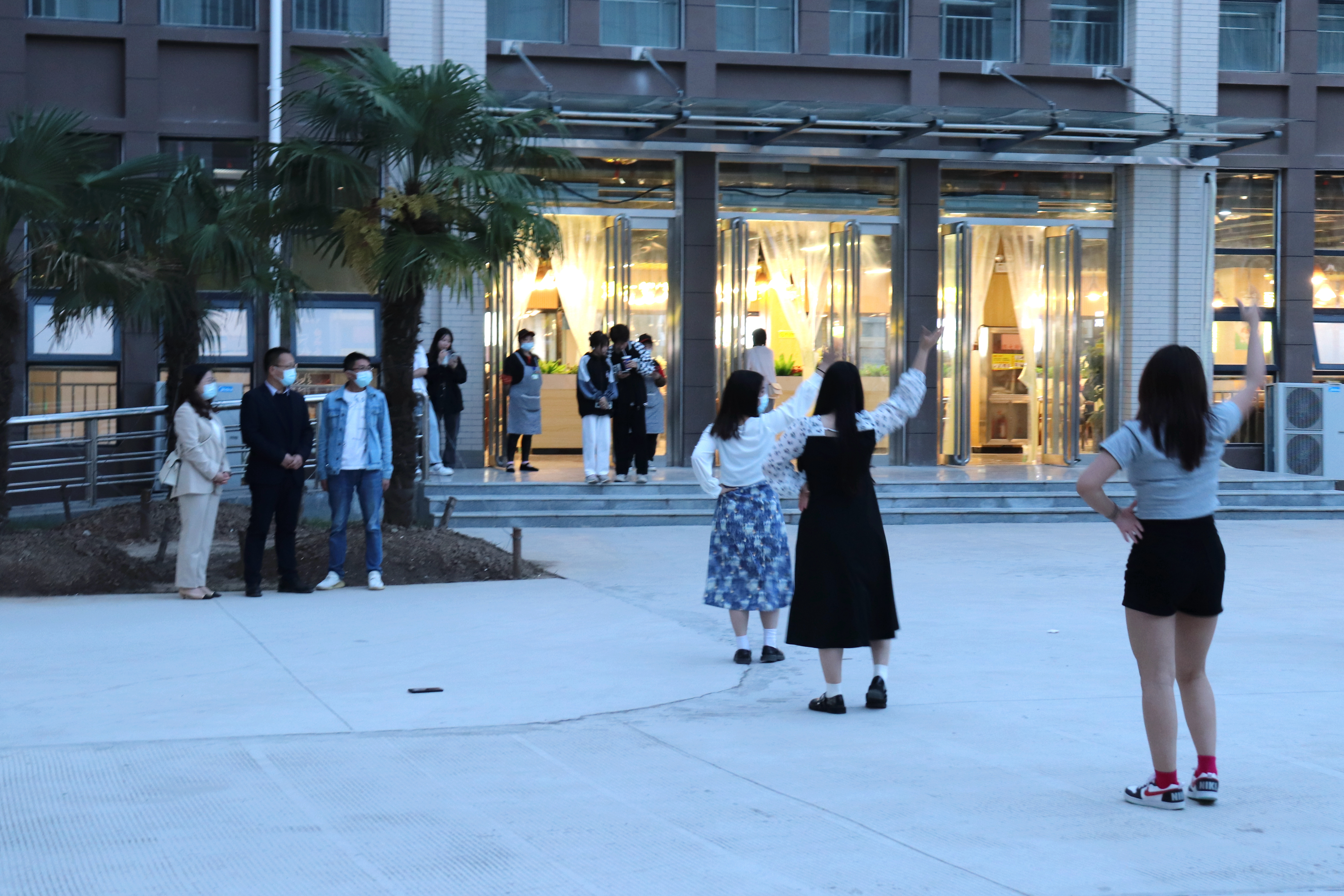 活动得到了学校领导的重视与关心。副校长付秋峰、学工处处长许明超亲临现场,关心疫情期间同学们的生活状况,与同学们共舞,外国语学院党总支书记莫修梅、团总支书记何龙陪同。