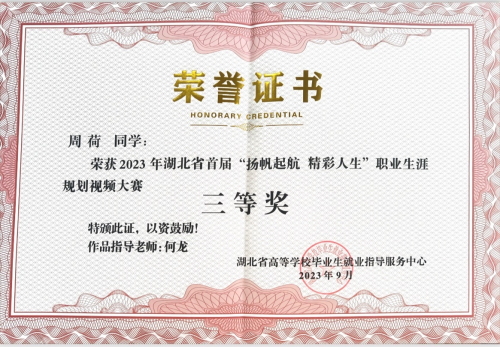 本网讯 近日,由湖北省高等学校毕业生就业指导服务中心主办、长江网承办的“扬帆起航精彩人生”湖北省首届大学生职业生涯规划短视频大赛获奖名单公布,我校教育学院周荷同学的参赛作品荣获三等奖。