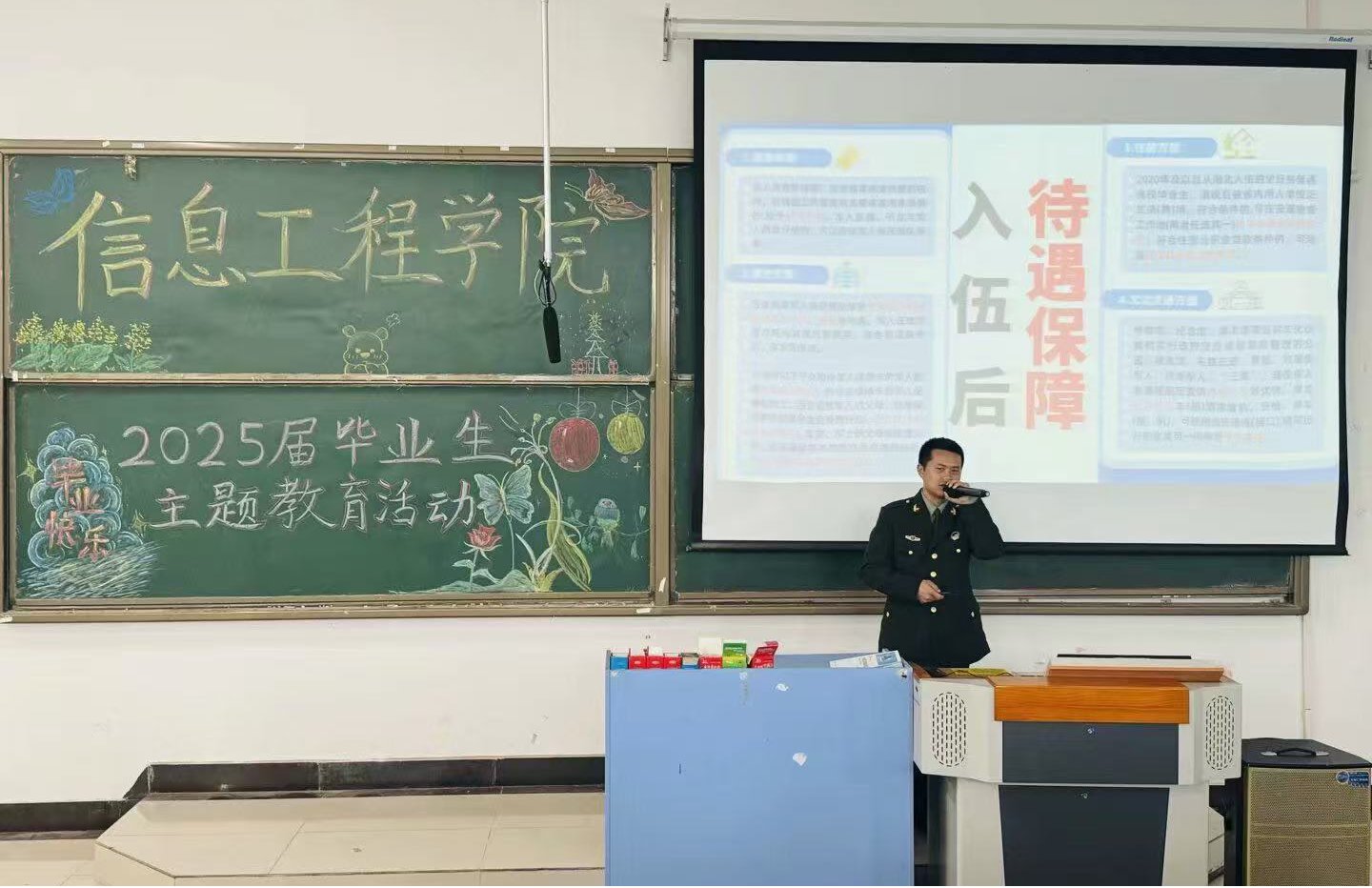 随后,信息工程学院辅导员刘怡辰上台发言。她对毕业生们的成长和进步感到无比欣慰,并分享了自己的人生经验和职业感悟。接着,计科62102班王琦同学上台发言,分享自己的军旅生涯。他详细介绍了大学生参军入伍的各项优惠政策,同时也解答了同学们关于参军入伍的诸多疑问。