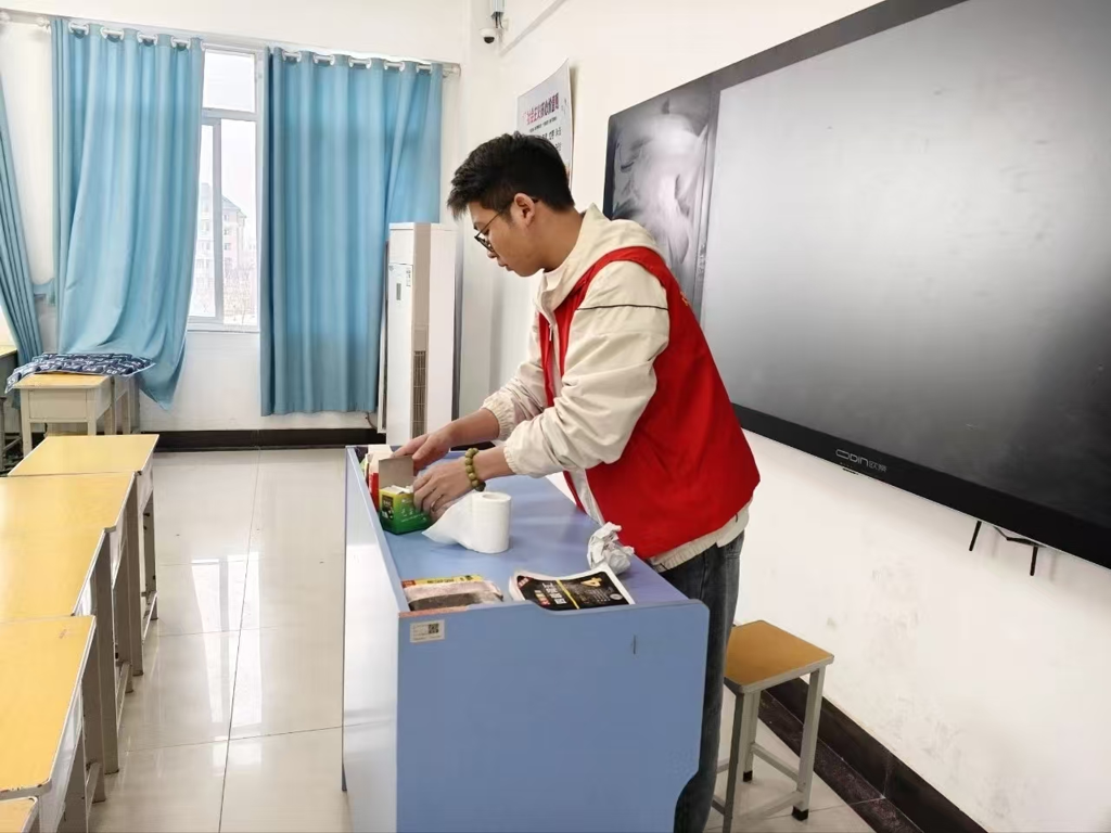 活动伊始,志愿者们在教学楼3102教室集合签到。随后,大家分工明确、相互配合,按照划分的责任区域对教学楼进行全面细致的清扫整理,以实际行动维护校园公共环境的整洁有序。
