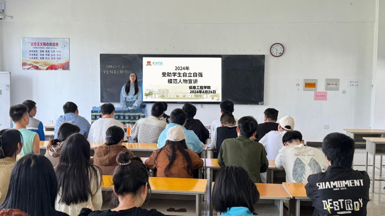 本网讯 为进一步分享受助学生的奋斗历程和成功经验,激励更多年轻人勇敢面对挑战,实现自我价值,信息工程学院于4月26日开展了以“自立自强,成就未来”为主题的受助学生自立自强模范人物宣讲会,本次宣讲会由信息工程学院辅导员秦昕主持,信息工程学院各班学生代表参与本次宣讲会。