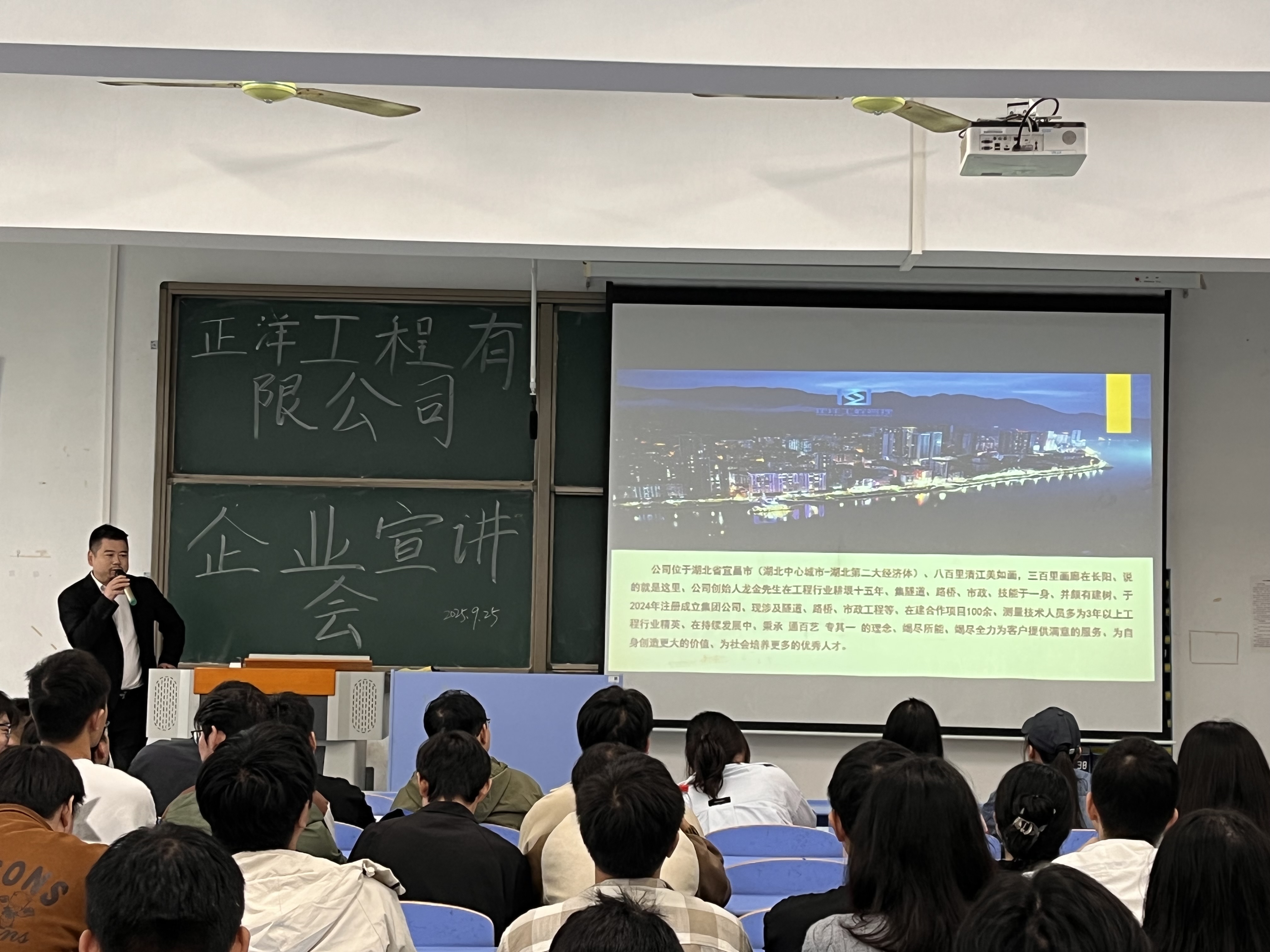 为进一步拓宽毕业生就业渠道,帮助同学们更好地了解行业发展动态,明确职业规划方向,9月25日上午10点30分,城市建设学院邀请了正洋工程管理有限公司走进校园,举办了一场别开生面的企业宣讲会。本次活动不仅让同学们深入了解了企业的发展历程与用人理念,也为即将踏入社会的毕业生提供了就业机会。