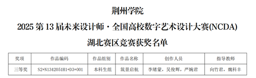 本网讯 近日,2025年第13届未来设计师·全国高校数字艺术设计大赛(NCDA)省级大赛圆满落幕,我院城乡规划专业李绪蒙、吴俊辉、严婉君同学共同创作的作品《筑景启航》荣获三等奖。