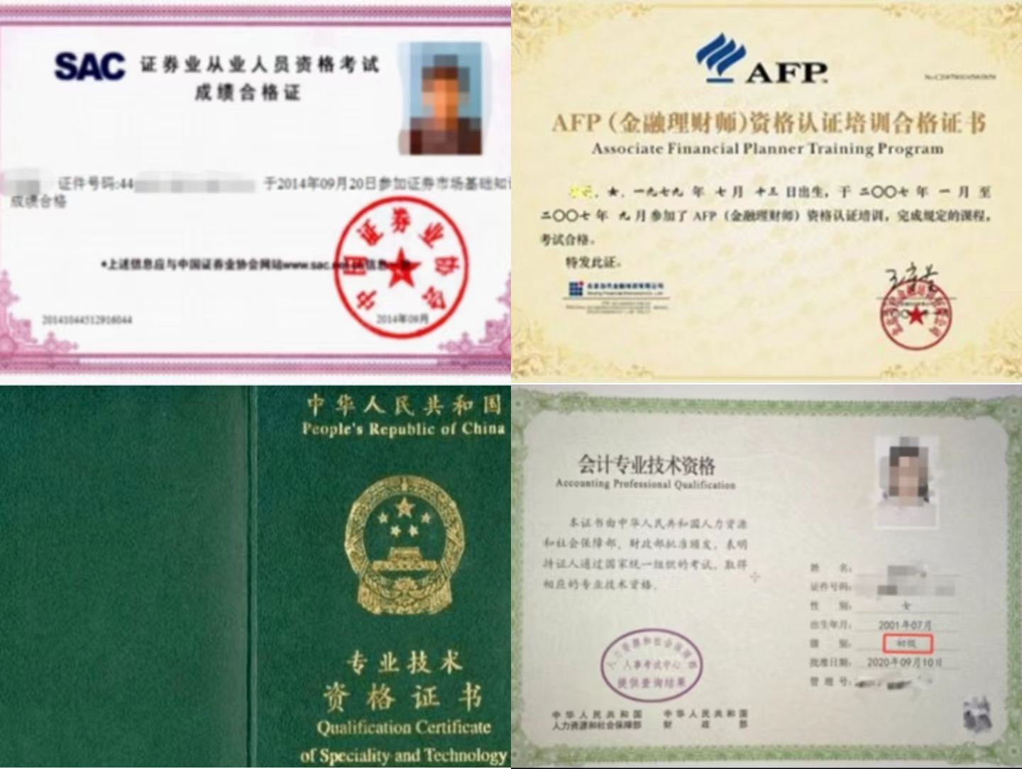智能财务师(FAI)、资产评估师、证券从业资格证(SAC)、统计师、初级会计师、中级会计师、高级会计师、注册会计师(CPA)、税务师、审计师、经济师、特许公认会计师(ACCA)、美国注册管理会计师(CMA)、特许金融分析师(CFA)、金融理财师(AFP)等。