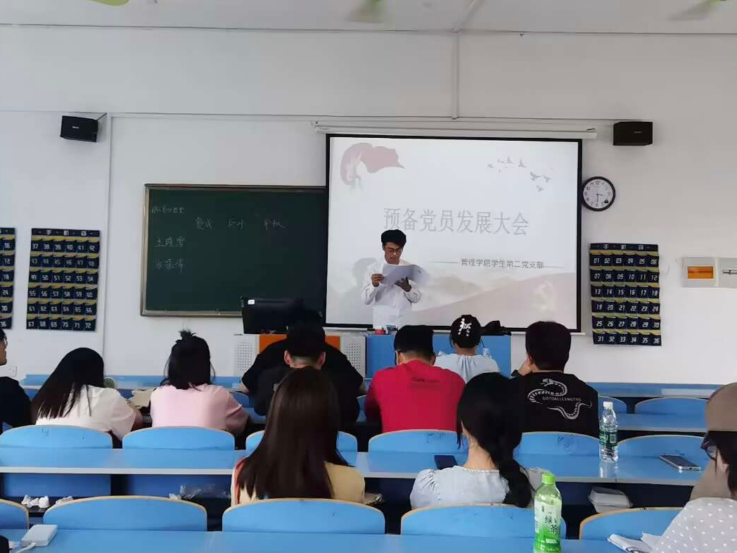 会议伊始,管理学院学生第二党支部书记毛佳宁老师介绍了党员发展的基本流程。发展党员严格按照党员发展程序,经过党支部严格考察和培养,王晓雪、张振瑞2名同学被列为发展对象,他们依次上台宣读入党志愿书,就自己一年来的表现进行思想汇报,包括学习、生活、思想等各方面内容表达了对加入中国共产党的坚定决心和为党的事业奋斗终身的强烈愿望。随后培养人分别介绍发展对象的现实表现。经党支部大会讨论并进行无记名投票表决,2名发展对象发展成为预备党员。