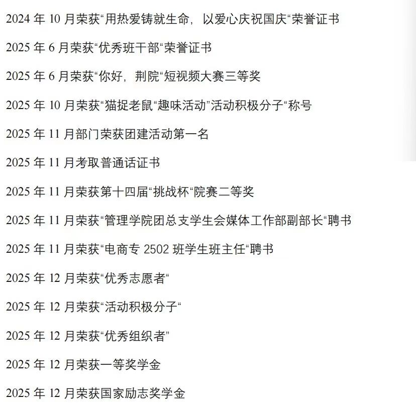 任职履历:曾担任管理学院团总支学生会组织部干事,电商专2401班军训负责人,现任电商专2401班班长、管理学院团总支学生会媒体工作部副部长、电商专2502班学生班主任、管理学院乡村振兴直播志愿服务队队员。