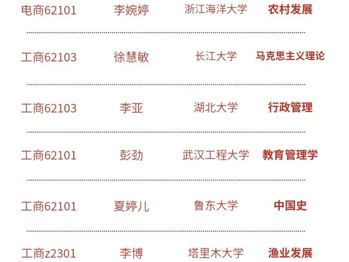 春风十里传捷报,桃李盈枝绽芳华。在2025年全国硕士研究生招生录取工作中,管院学子表现优异,取得可喜成绩,共计录取6名同学,他们分别以优异的成绩被浙江海洋大学,长江大学,湖北大学,武汉工程大学,鲁东大学,塔里木大学等院校录取,进一步彰显管院学子锐意进取的求学精神,凝聚了全院师生勠力同心的育人硕果,为学校高质量发展添上浓墨重彩的一笔。祝愿他们在求学路上砥砺奋进,再创佳绩。也希望广大管院学子,以他们为榜样,奋发有为,不断超越,在未来创造属于自己的精彩篇章!