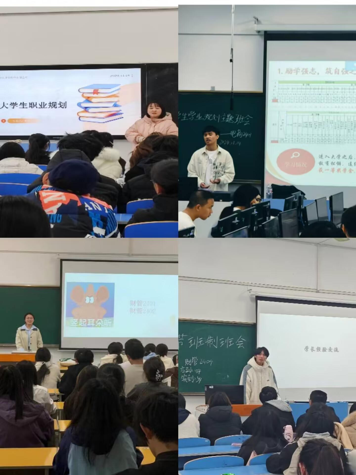 管理学院副院长徐晓晗老师在工商2402班的班会上提醒同学们要结合自己的兴趣、优势和未来职业规划,学好专业知识,做出明智决策,鼓励同学们不要畏惧困难与挑战,要勇于尝试新事物,在实践中不断探索与发现自己的潜力与兴趣点,并表达了对同学们的未来期许;电商2401班教师党员,电子商务专业教研室主任鲁衎老师则强调了时间管理是确保学业规划有效进行的关键因素之一,向同学们介绍了制定计划,列出任务清单,包括课程学习、作业、考试复习、阅读书籍等所有学业相关事项,按重要性和紧急程度排序这一学习方法;会计教研室主任范苏丹老师则与财管2401、财管2402两个班级提出“四个方面”——确定学习目标、分析课程需求、合理利用学习资源、监测学习进度,强调平时的积累十分重要。除此之外,各班老师还为同学们提供了许多具体而实用的方法。如目标导向学习法、番茄工作法、预习 - 学习 - 复习三步法。也提醒同学们学业规划不是一成不变的,是动态的,应当根据自身实际情况实时调整规划,千万不可陷入思维的“死胡同”,确保学业规划始终与个人发展需求和外部环境相适应。