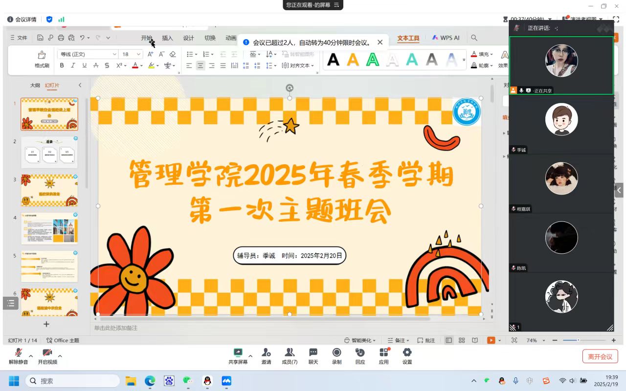 本网讯(通讯员:王奇名)为切实做好新学期学生教育管理工作,引导学生尽快适应学习生活节奏,强化安全意识与心理健康意识,以昂扬向上的精神面貌迎接新学期,管理学院各辅导员于2月20日-21日与所带班级以线上形式陆续开展2025年春季学期第一次主题班会。