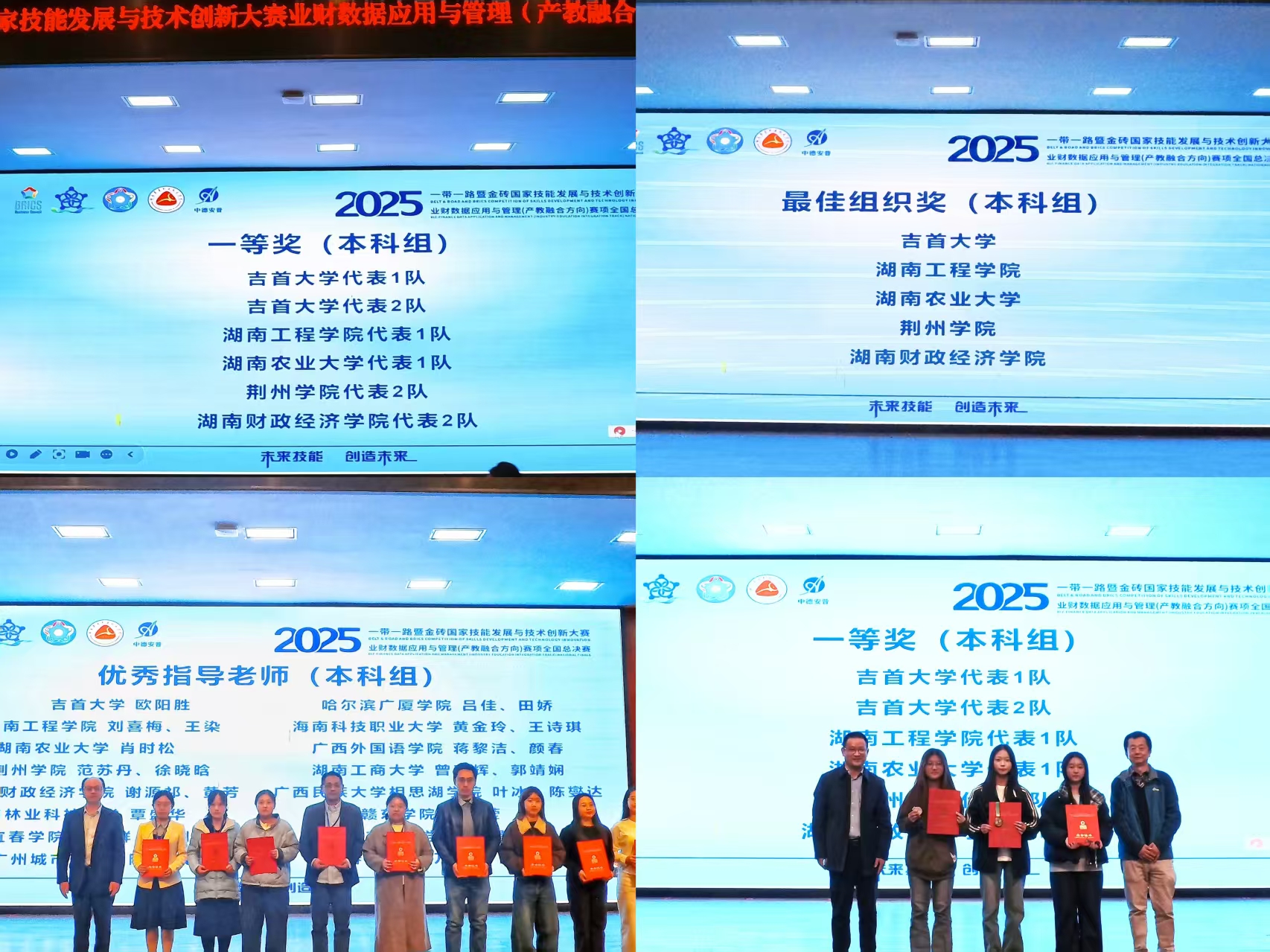 本网讯(通讯员:龙忠成)11月29日,2025年“一带一路”暨金砖国家技能发展与技术创新大赛业财数据应用与管理(产教融合方向)赛项全国总决赛在长沙圆满落幕。来自全国本科、高职、中职院校及相关企业的1400余名选手、400余支队伍同台竞技,我院代表队斩获本科组一等奖,指导教师获评“优秀指导教师”、学校荣膺“最佳组织奖”。