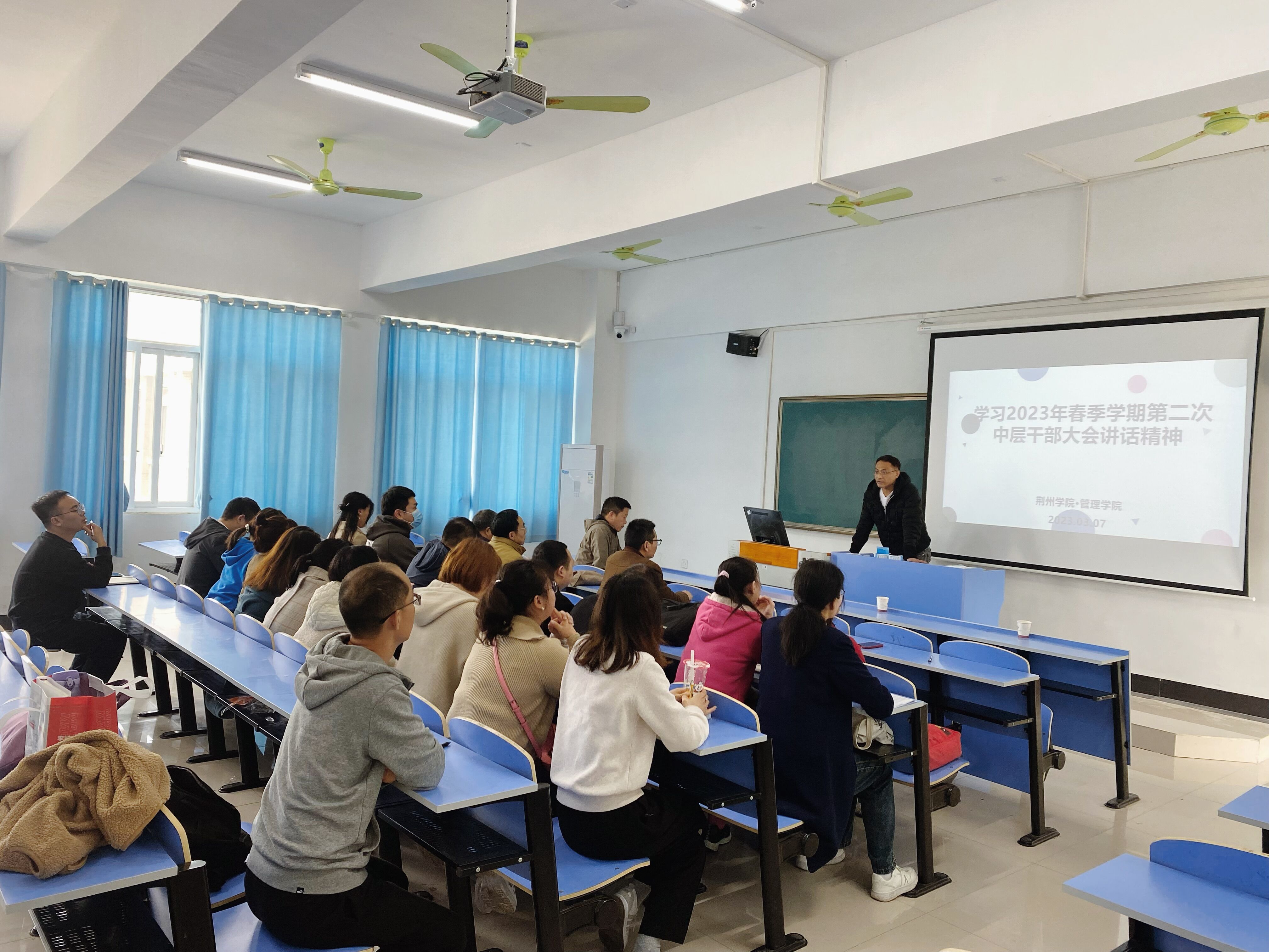本网讯 3月7日中午,管理学院在J6408教室组织分院全体教职工集中学习了学校2023年春季学期第二次中层干部会议讲话精神,会议由管理学院副院长徐晓晗主持,管理学院党总支副书记冯尧及分院全体教师和辅导员参加了会议。
