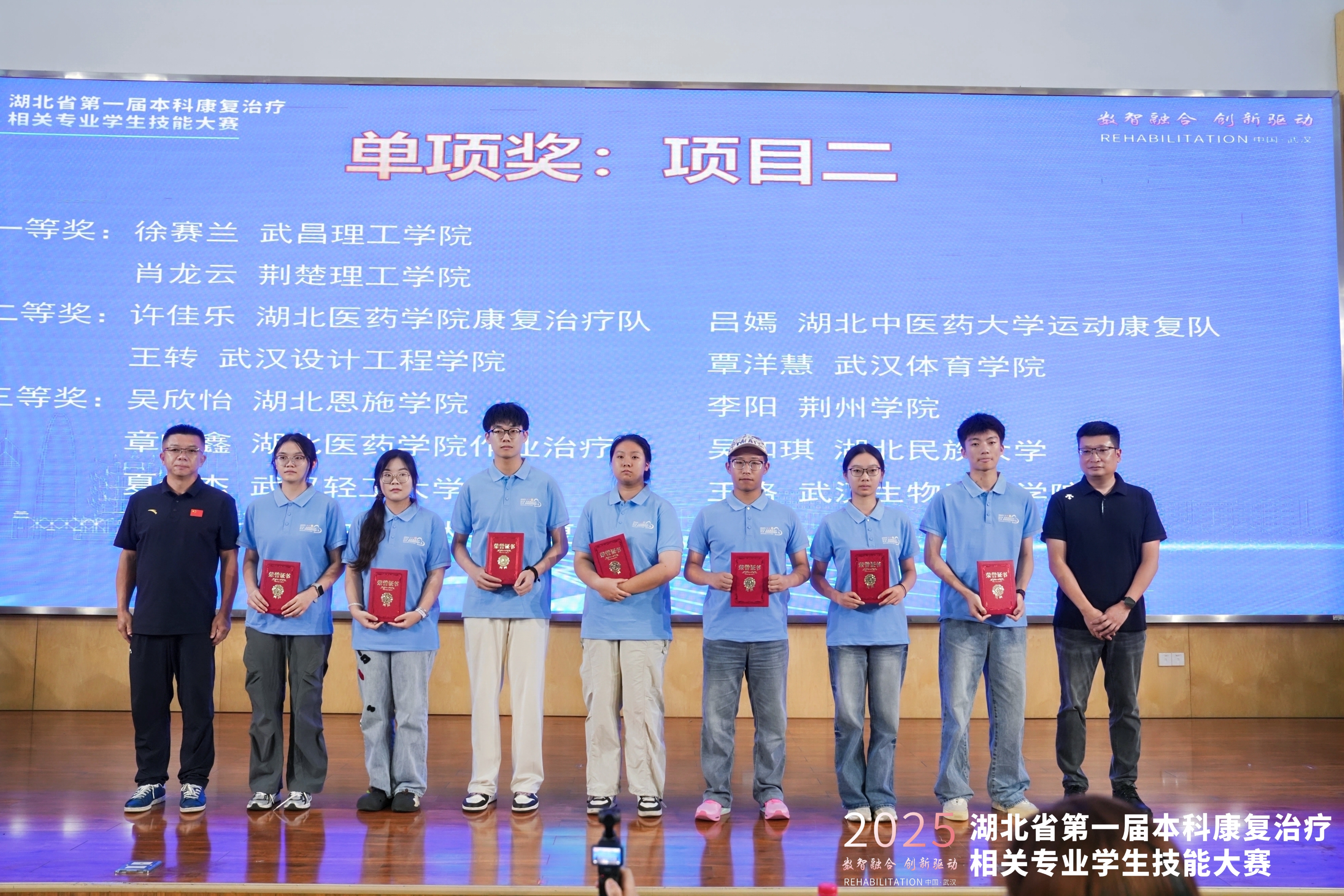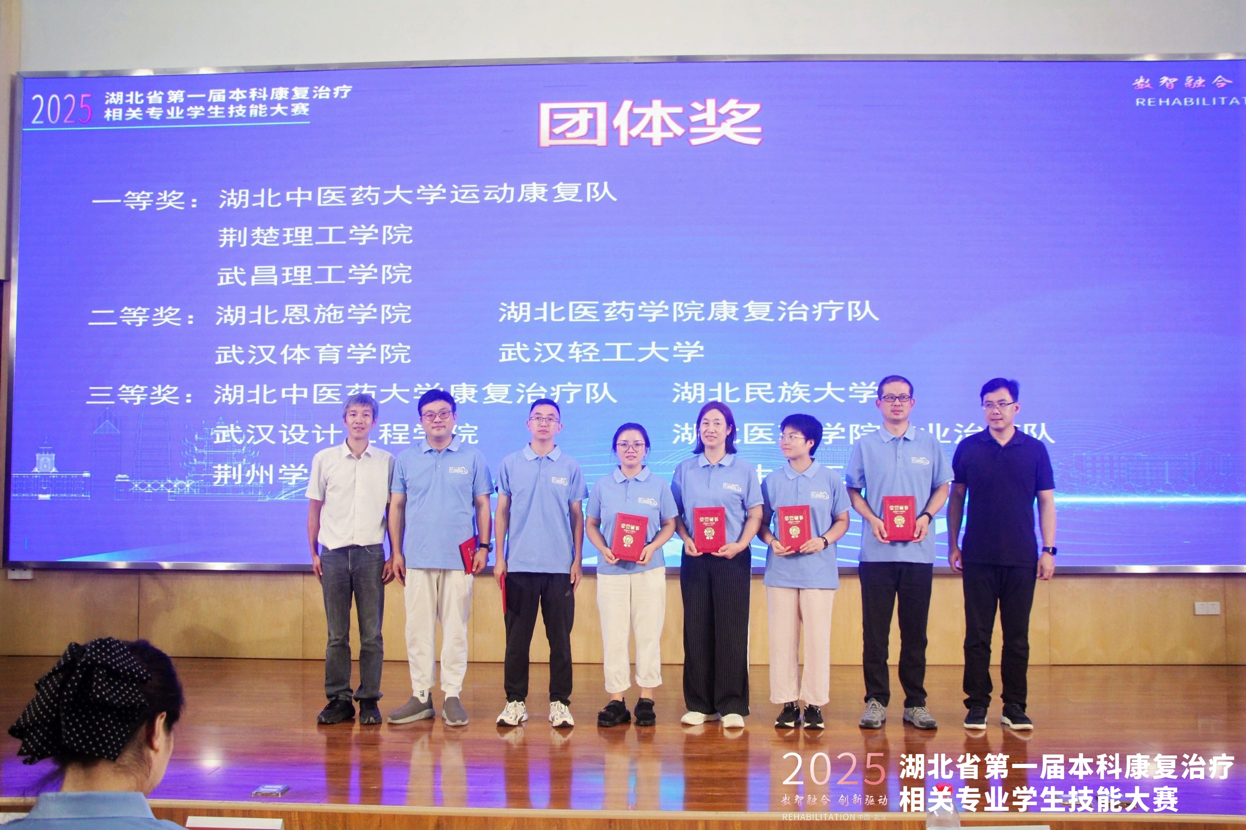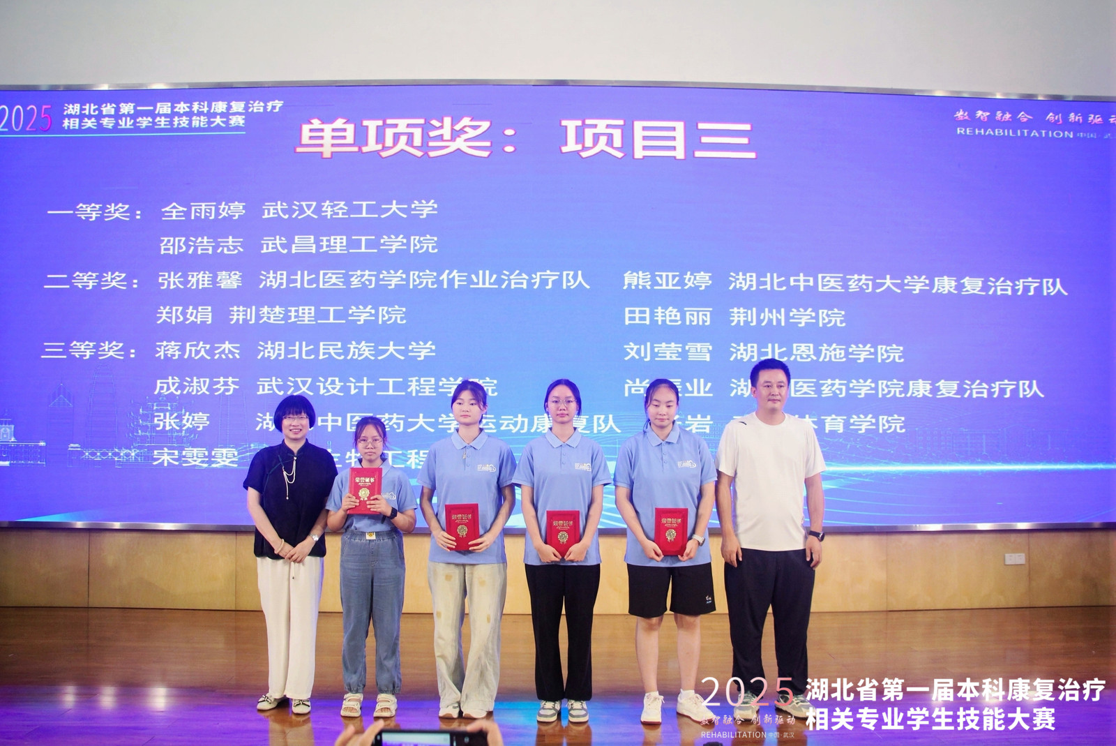 本次大赛由湖北省康复医学会康复教育专业委员会主办,来自全省多所高校参加比赛,致力于提升康复治疗学专业学生的实践操作能力和专业素养,激发学生对专业技能的学习热情,增强学生就业竞争力。大赛采用团队赛制,由线上虚拟赛项和虚实结合线下操作赛项(康复问诊、康复评定、康复治疗)两部分内容组成。