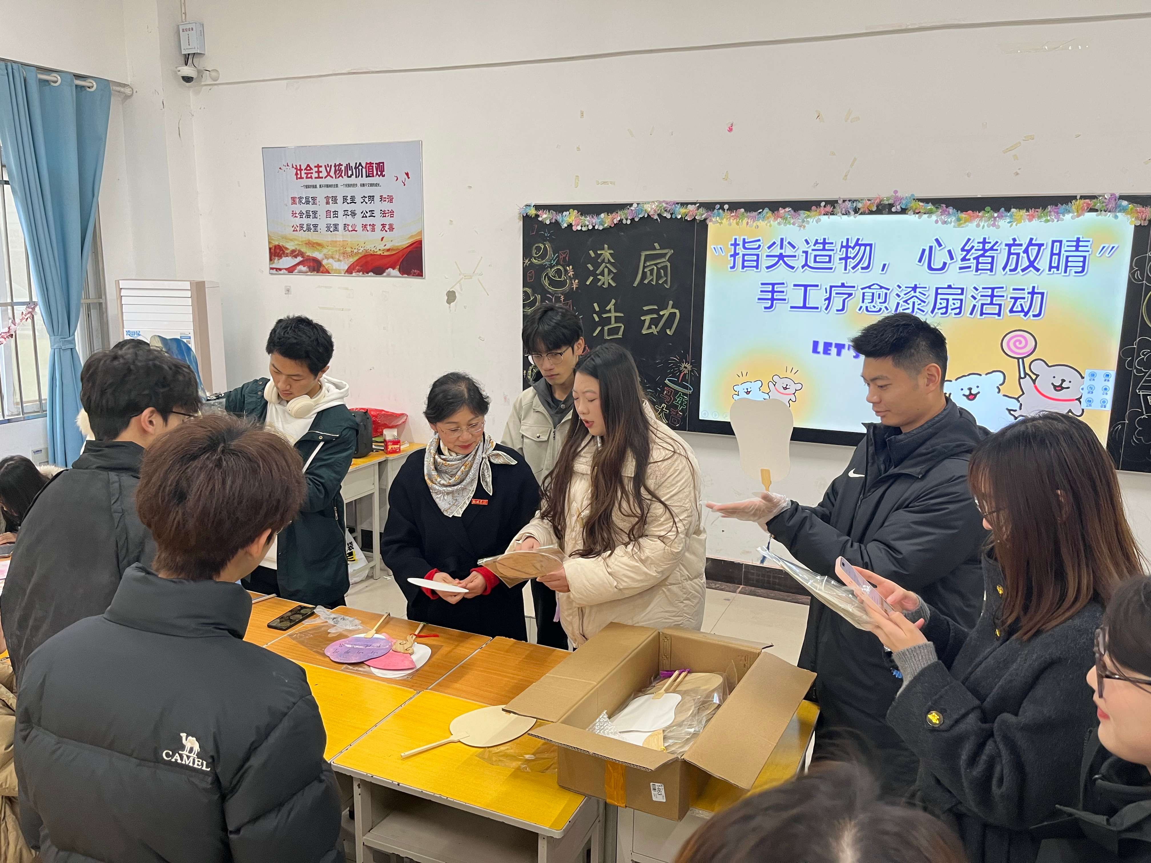本网讯(通讯员 黄子健)12月18日,智能制造学院在4102教室成功举办“指尖造物,心绪放晴”手工漆扇疗愈活动,以传统工艺助力学子解压、放空心绪。本次活动由该院心理辅导站精心策划,学院党总支书记、全体辅导员及各年级学生热情参与。