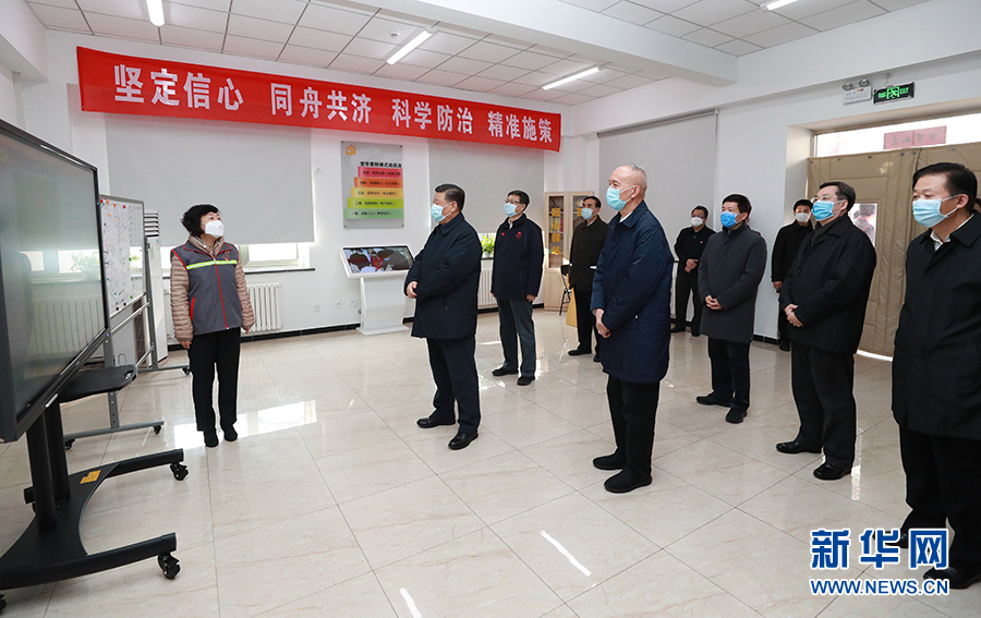 习近平首先来到北京市朝阳区安贞街道安华里社区,了解基层一线疫情联防联控情况。在社区居民委员会疫情防控指挥部,习近平听取了安贞街道和安华里社区开展联防联控情况介绍。习近平对社区采取多项措施,落实防控责任,实现入户排查、重点群体监控“两个全覆盖”等做法表示肯定。他强调,社区是疫情联防联控的第一线,也是外防输入、内防扩散最有效的防线。把社区这道防线守住,就能有效切断疫情扩散蔓延的渠道。全国都要充分发挥社区在疫情防控中的阻击作用,把防控力量向社区下沉,加强社区各项防控措施的落实,使所有社区成为疫情防控的坚强堡垒。要以疫情防控工作成效来检验和拓展“不忘初心、牢记使命”主题教育成果,发挥基层党组织政治引领作用和党员先锋模范作用,把社区居民发动起来,构筑起疫情防控的人民防线。