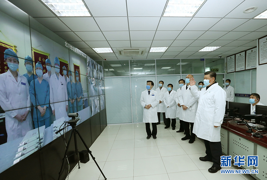 2月10日,中共中央总书记、国家主席、中央军委主席习近平在北京调研指导新冠肺炎疫情防控工作。这是习近平来到首都医科大学附属北京地坛医院门诊楼一层运行监控中心,通过监控画面察看患者住院诊疗情况,并视频连线正在病房值班的医务人员。新华社记者 鞠鹏 摄