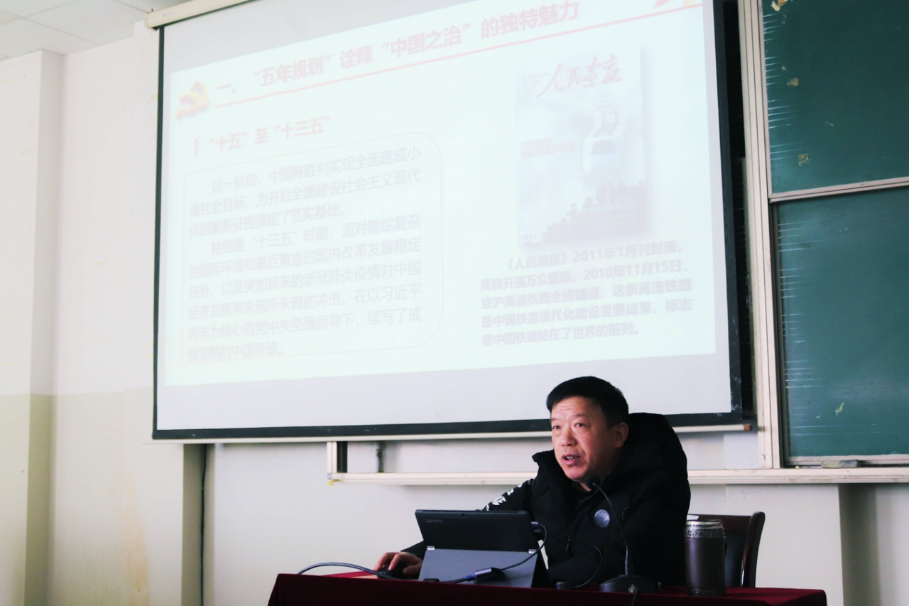 会上,金书记以《擘画新蓝图开启新征程》为题,从“五年规划”诠释“中国之治”的独特魅力、党的十九届五中全会召开的背景、党的十九届五中全会《建议》的主要内容、开启全面建设社会主义现代化国家新征程、以卓有成效的工作贯彻落实五中全会精神5个方面开始,分别谈了十九届五中全会召开的背景、主要成果、《建议》起草情况、《建议》的主要内容和亮点、《建议》的核心要义等内容。金书记还谈到了“十四五”期间学院的主要目标与任务。他要求:各单位要提高工作站位,谋划学院工作;教职工要提高工作能力,切实履职尽责;全院党员要依托本职岗位,发挥模范作用。