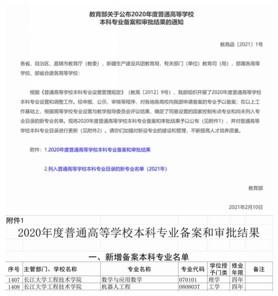综合要闻 缤纷校园 教学科研 媒体荆院 通知公告 学术动态 【学院动态】我院新增2个本科专业 来源: 编审: 审核: 签审: 日期:2021-03-02 本网讯(记者 黄思琦)近日,教育部公布了2020年度普通高等学校本科专业备案或审批结果(教高函〔2021〕1号),我院申报的数学与应用数学、机器人工程两个本科专业通过审核。这是我院在专业设置和调整工作中又一可喜成果。 上一篇: 【专题学习】习近平在中央党校(国家行政学院)中青年干部培训班开班式上发表重要讲话 下一篇: 【科研动态】陈希湘老师论文荣获荆州市第十三届自然科学优秀学术论文一等奖 返回列表页 最新文章 【学校动态】学校党委召开2026年春季学期党建... 【组织学习】WilliamHill中文官方网站党委理论学习中心组召开... 【学校动态】我校组织参加2026年本科教学工作... 【校企合作】WilliamHill中文官方网站与湖北康盟中药有限公司... 【学校动态】学校召开2026年校级智慧课程立项... 【喜讯】我校入选全国高校“大思政课”实践教学...