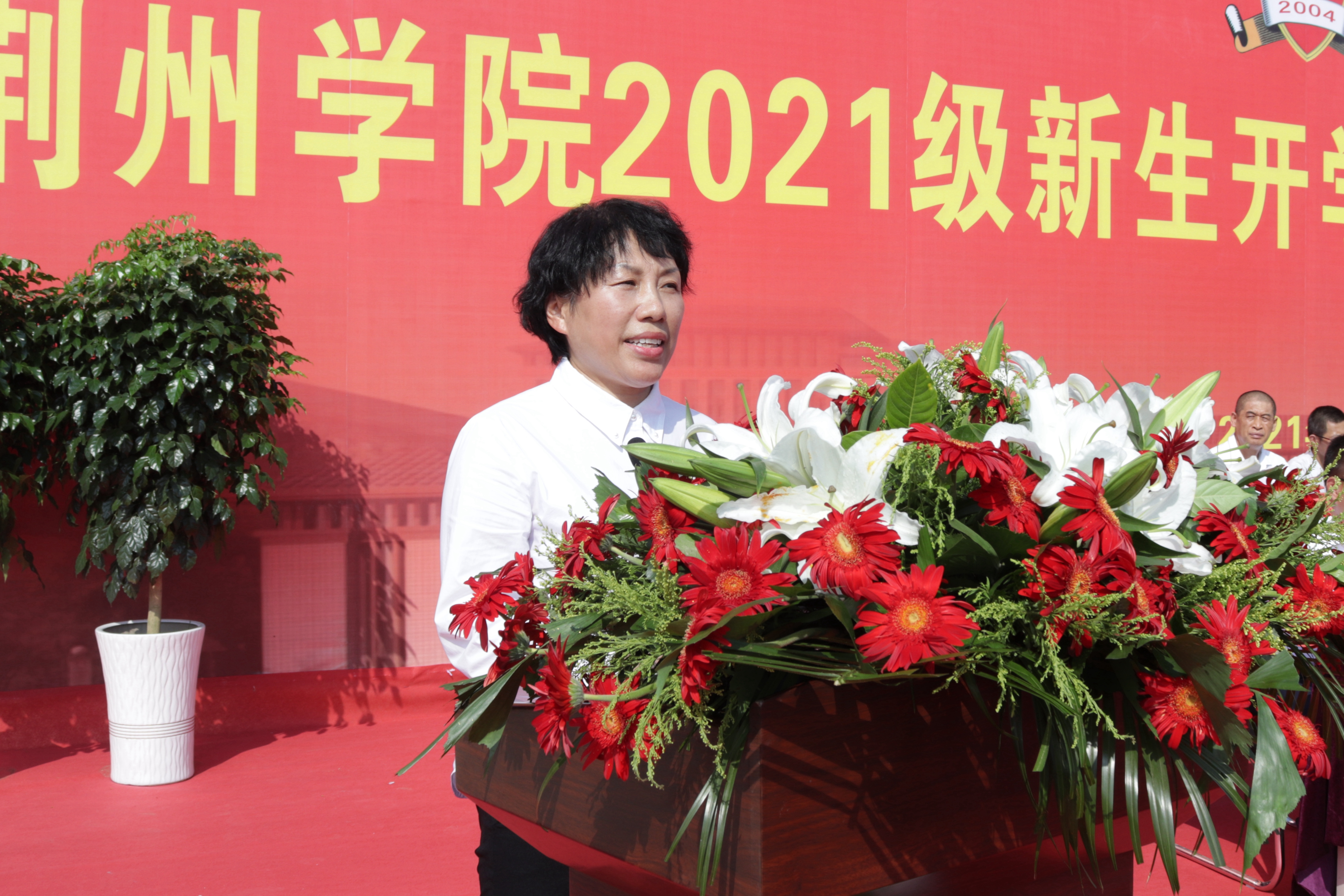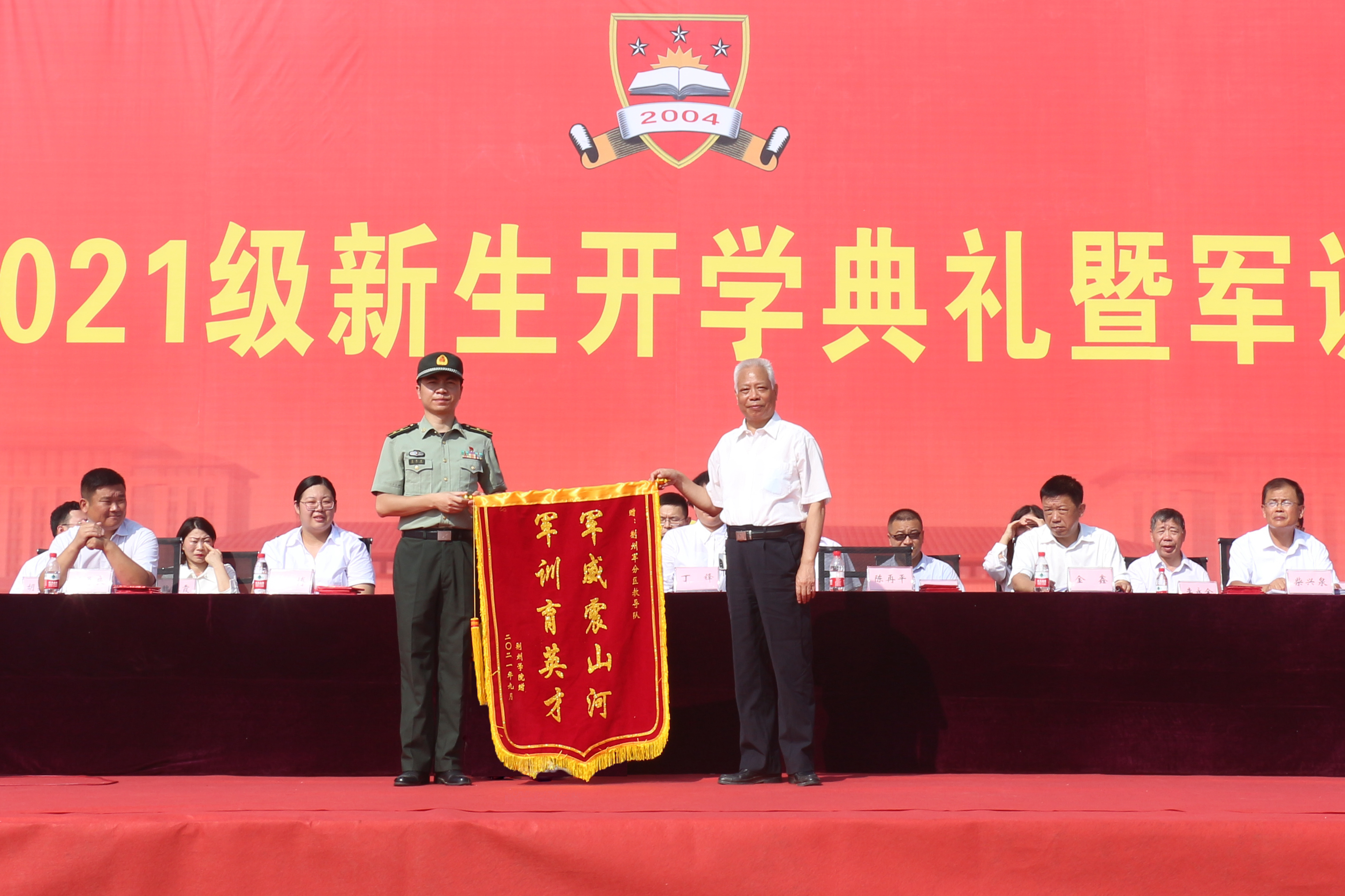 校长陈再平代表学校向荆州军分区教导队赠送锦旗。党委书记金鑫宣读表彰文件,对军训期间的先进个人予以表彰,与会领导为获奖者颁奖。