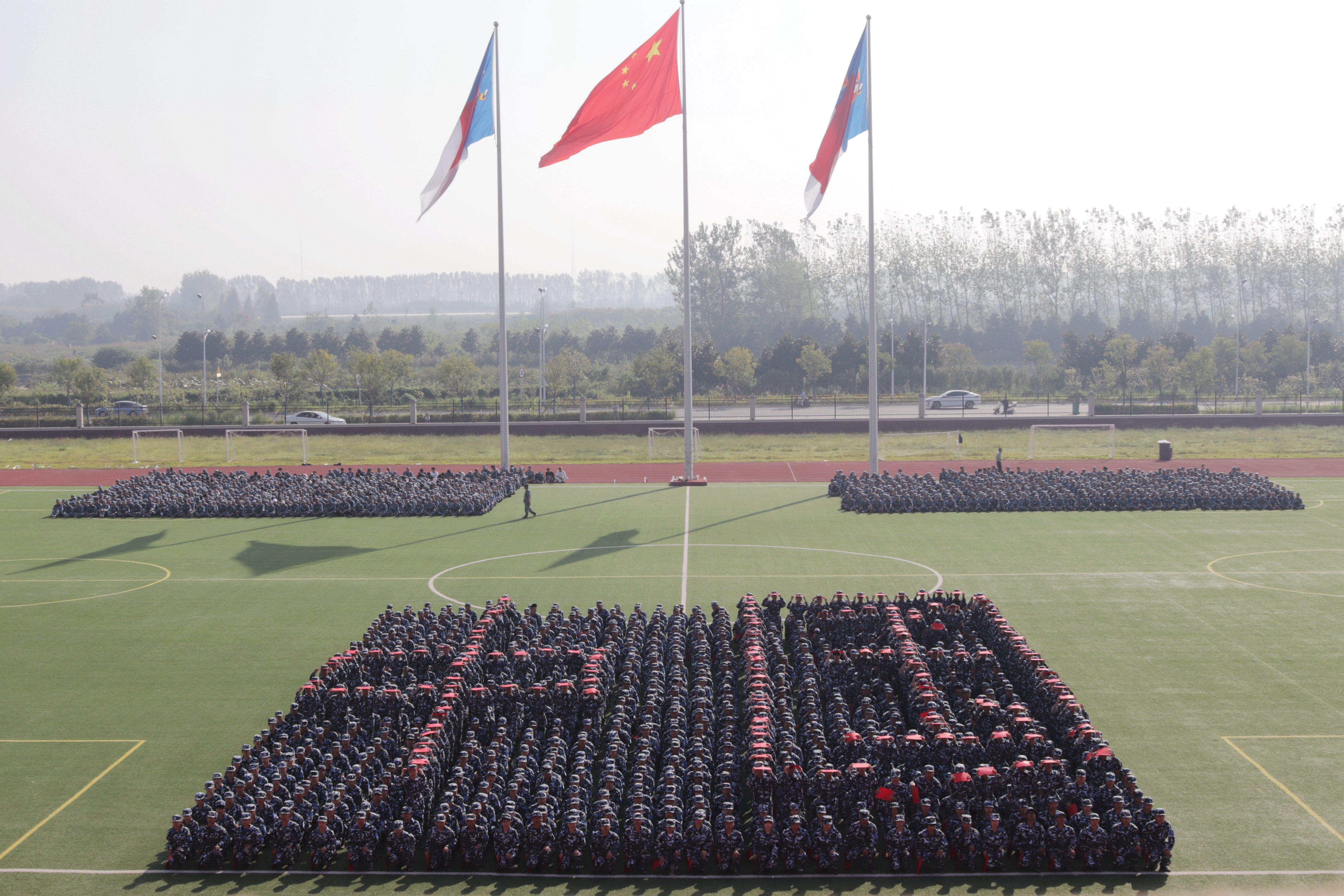 开学典礼在庄严的国歌声中拉开序幕。接受检阅的3855名新生精神抖擞,身着迷彩,用飒爽的英姿和响亮的口号依次入场。方阵字表演、匕首操、战术演练等特色方队表演,展现了昂扬向上的青春风采,“请党放心,强国有我!”铿锵有力的口号响彻校园。