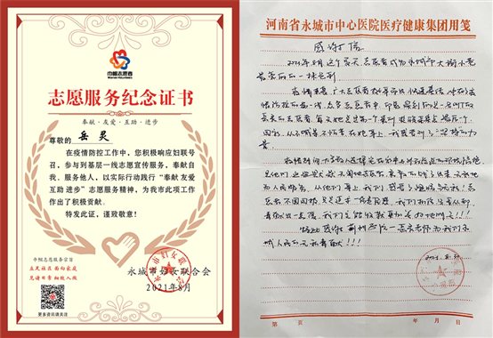 本网讯(记者 黄思琦)近日,我校收到了河南省永城市中心医院的感谢信,对我校教务处岳灵同志在疫情期间勇担志愿者表示感谢。