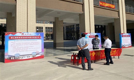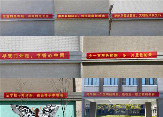图为校园内悬挂横幅标语,营造氛围