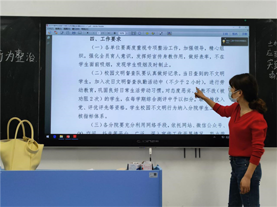 3月,学校各个班级组织召开“文明新风,从我做起”主题班会。会上辅导员向学生宣传吸烟的危害,教育提醒学生禁止在校园公共场所和宿舍内吸烟,注意公共区域异性交往举止得体、不携带食品进入教室和图书馆,强调本次专项整治有关要求,加强学生教育引导。