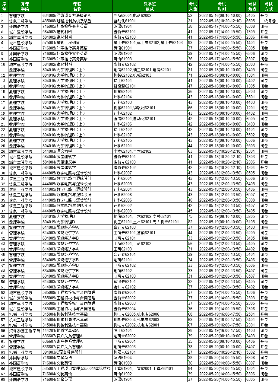 2021-2022学年第二学期期末考试安排(第13周)