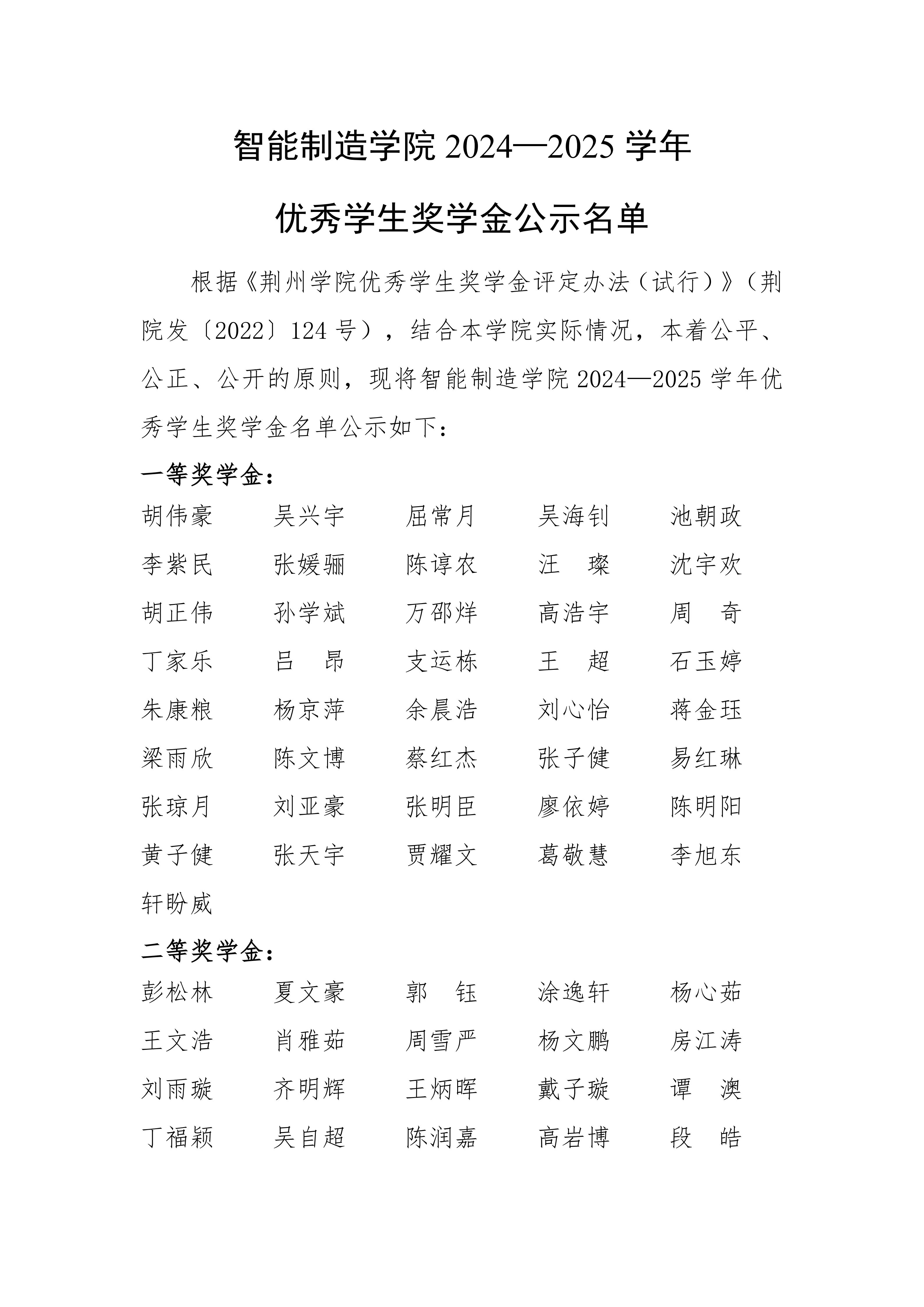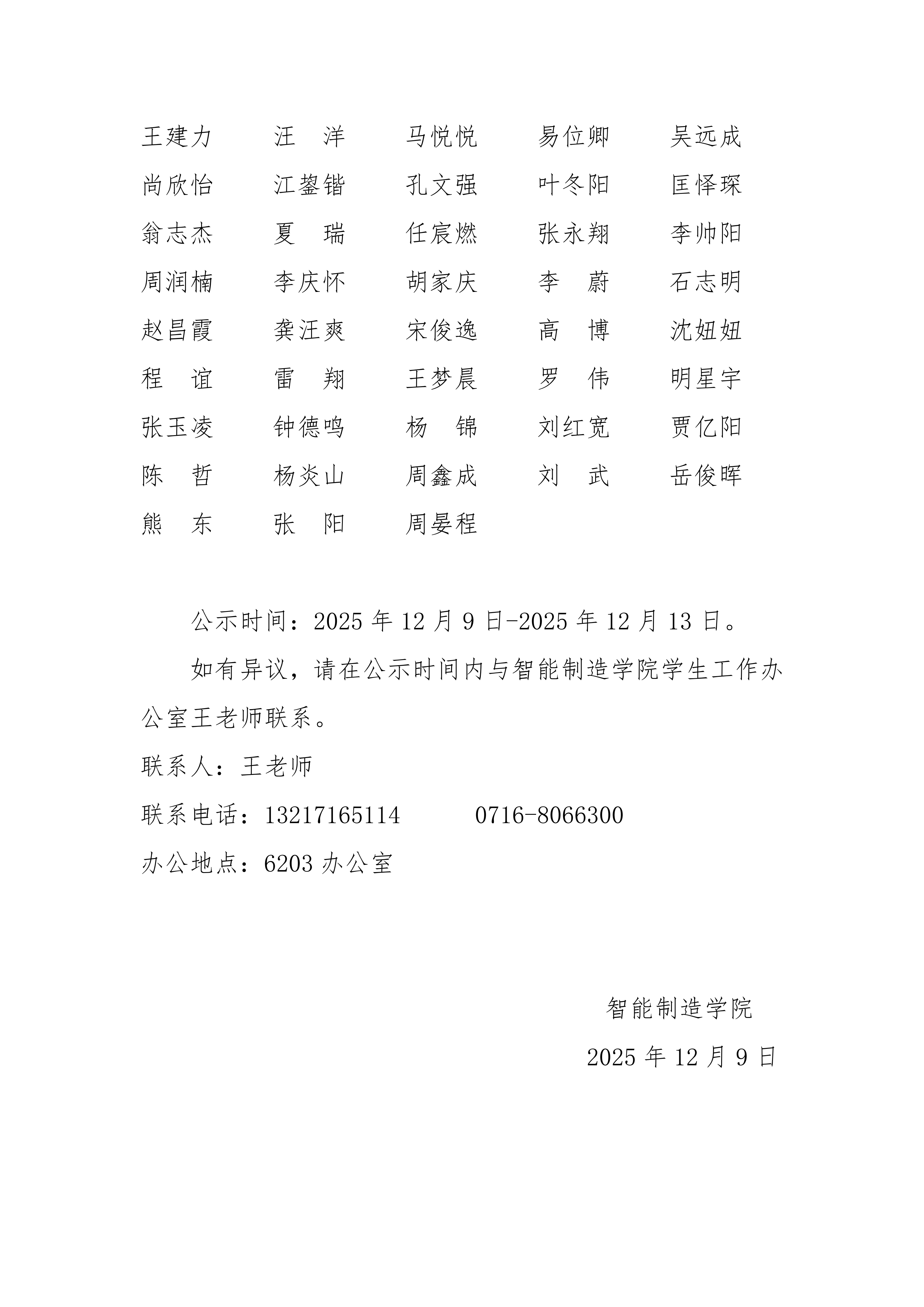 智能制造学院2024-2025学年优秀学生奖学金公示名单