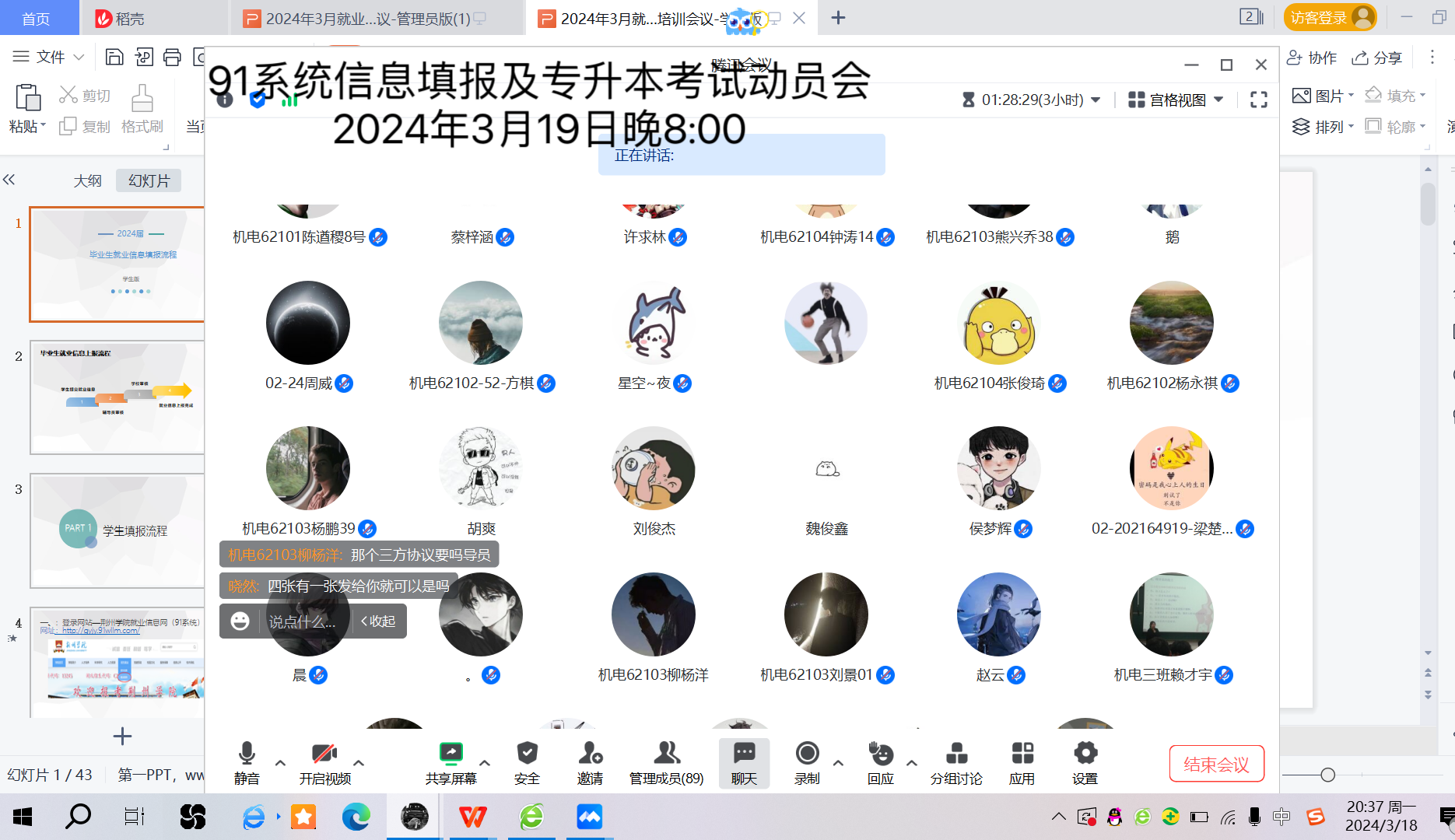 会上王老师鼓励专科同学们积极报考,要有明确的目标,必胜的信念,阳光的心态迎接本次专升本考试。对于考试流程,时间节点,政策文件、报考专业及复习大纲做了详细的解读。同学们小小的脑袋装着大大的疑惑,在线上不断发问,王老师耐心回答,会议氛围很融洽,参加会议的人有将近100人,很多同学是在吃饭时间参会,有些还要赶着上夜班,但无论生活多么忙碌与疲惫,每位同学都非常重视自己的学业和就业问题。