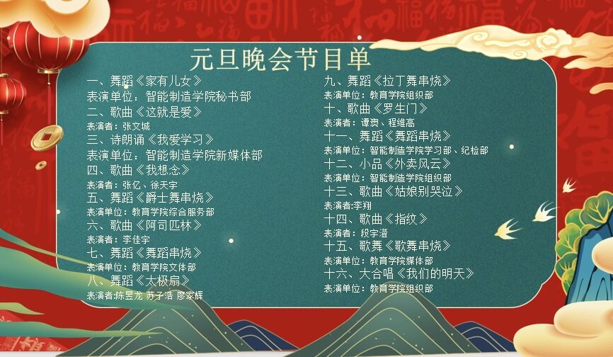 本次晚会的节目由智能制造学院与教育学院团总支学生会共同选送,共计16个节目,节目涵盖歌曲、舞蹈串烧、小品、诗朗诵等类型。