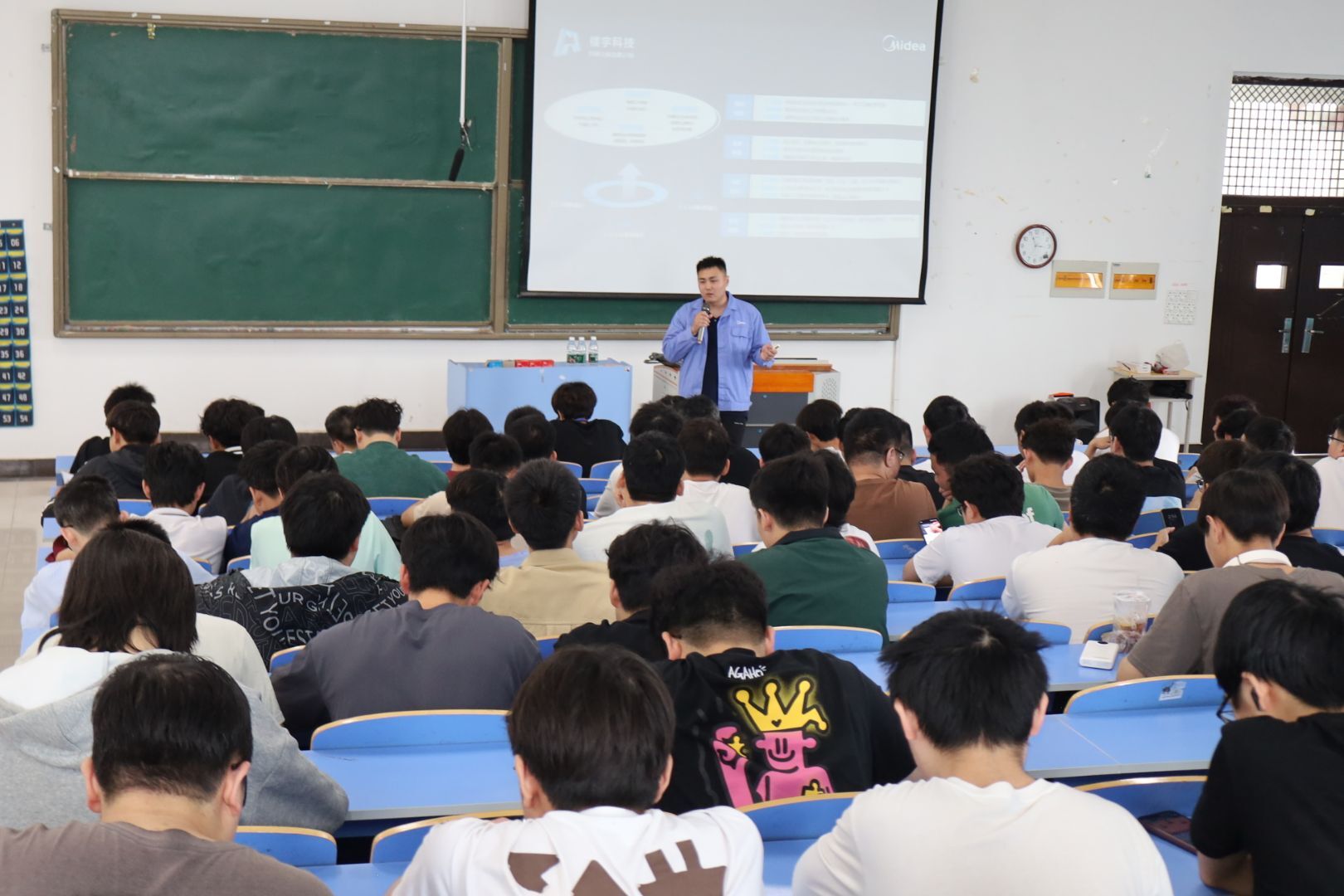 宣讲会现场,王艳书记与企业代表就人才培养、产学研合作等议题展开深入交流。美的楼宇HR刘永利通过宣传片、互动问答等形式,向学子们展示了企业在智能家居、工业技术等领域的创新成果,重点介绍了"绿色低碳、数字赋能"的发展理念,让学生了解行业的发展前景,现场反响热烈。