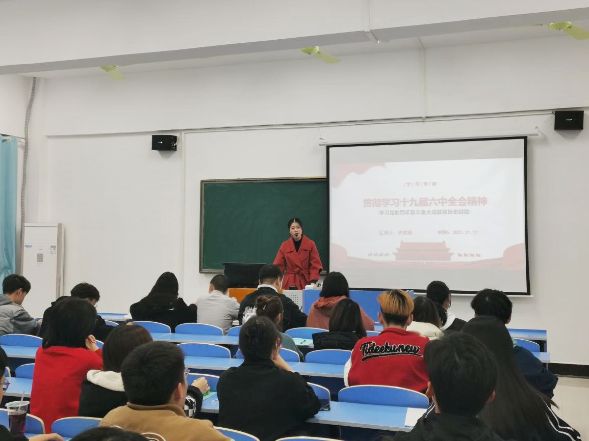 此次党的十九届六中全会精神专题学习会由马克思主义学院副教授史苗苗主讲,史老师以党的百年历史为切入点,为学员们深入解读了解读党的十九届六中全会的“三个需要”“两个确立”“五大历史意义” “十个坚持”“牢记一个根本问题”“四个必须”“一个号召”等核心要点,勉励青年学子们要深刻理解全会精神,提高自身的政治责任感与使命感,通过自身的不懈奋斗为国家发展助力、为自我人生添彩。