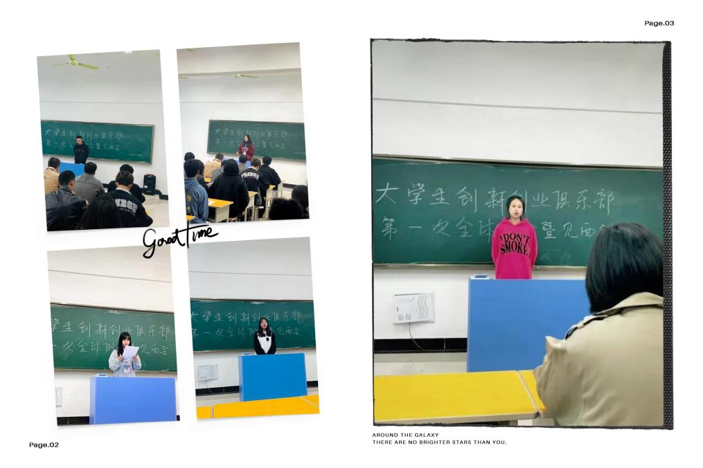 最后,大学生创新创业俱乐部第一次全体例会暨师生见面会在新干事的自我介绍中圆满落幕。“海阔凭鱼跃,天高任鸟飞”希望大创俱乐部是你们放飞梦想的地方希望你们能够在这里展现自己的聪明才智塑造多姿多彩的金色年华。