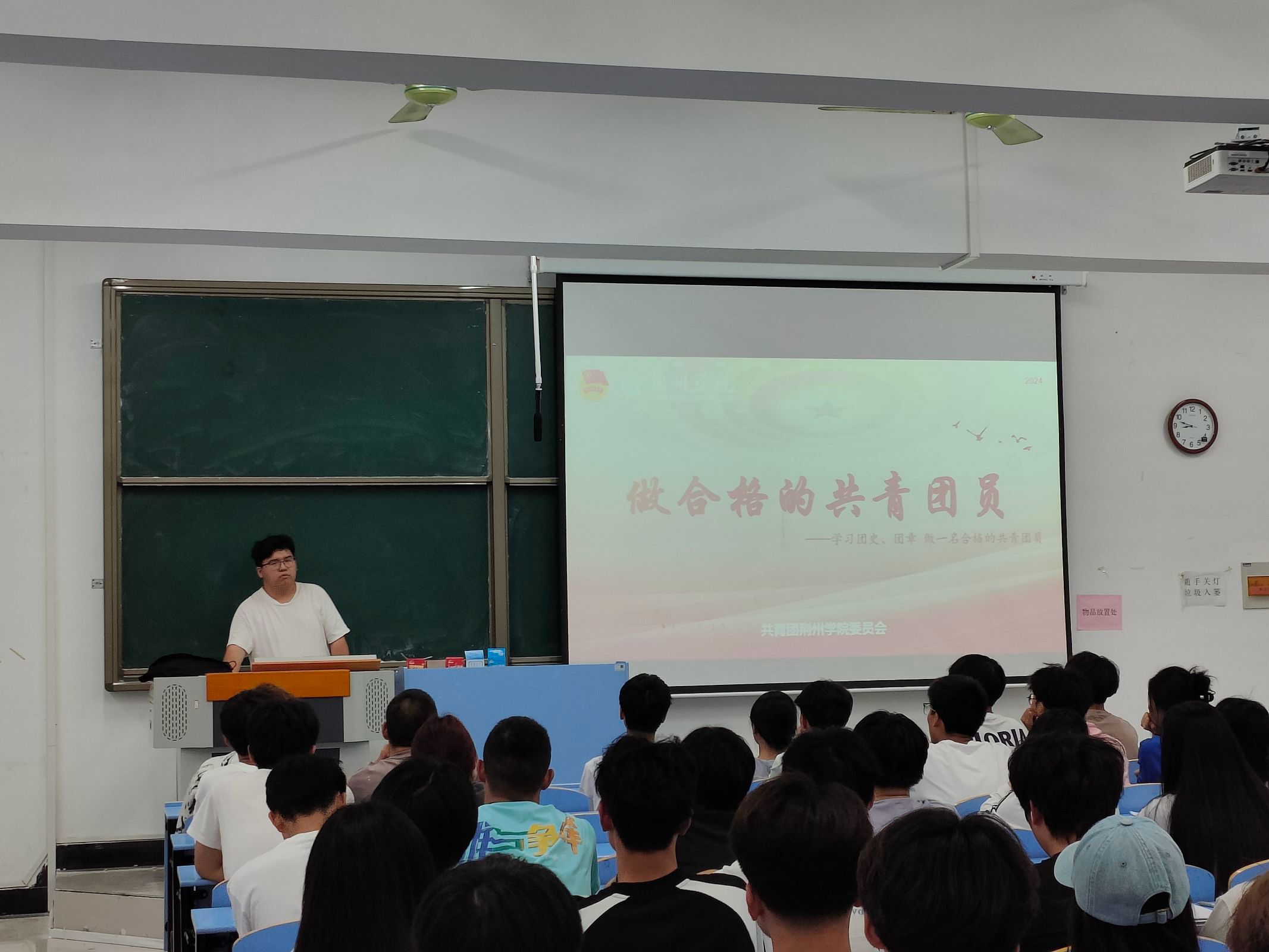 本网讯(通讯员 倪礼言)为深入学习贯彻习近平新时代中国特色社会主义思想和党的二十大精神,贯彻落实习近平总书记关于加强新时代团员队伍先进性建设的重要指示,推进全面从严治团,切实提高发展团员工作质量,4月25日晚,校团委组织开展本学期新入团员团前教育团校培训。本次培训由校团委学生副书记车宏扬主讲。