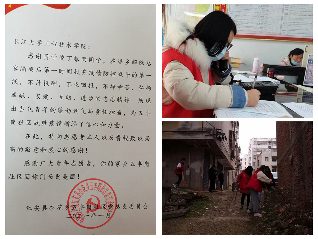 本网讯  抗击疫情仍在继续。寒假期间,外国语学院学前62004班丁银雨同学在自己的家乡红安县五丰岗社区担任社区志愿者,她优异的表现获得了社区的一致好评,特向学校发来了感谢信。