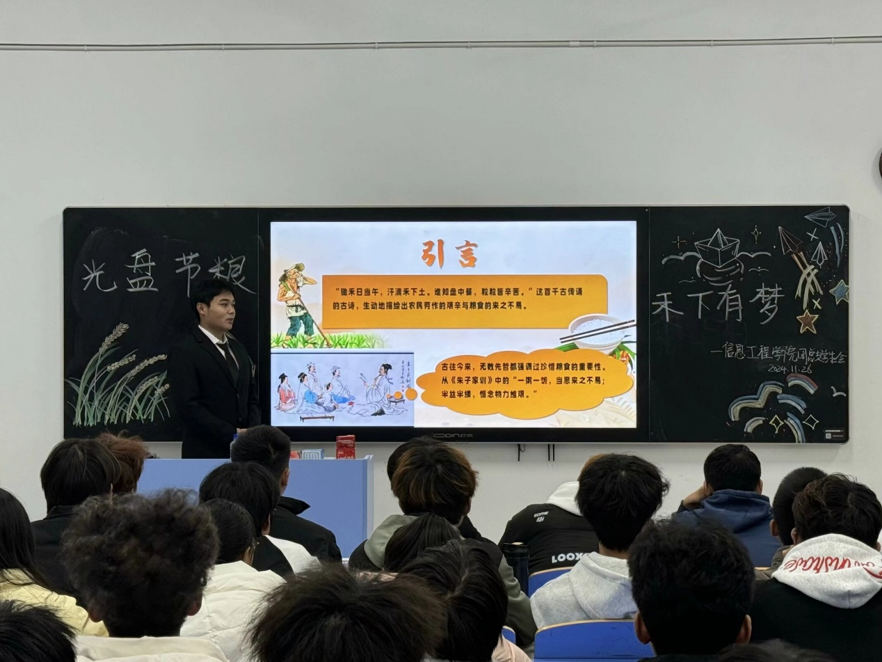 本网讯(通讯员 马舒翕)为进一步加强同学们节约粮食的意识,弘扬勤俭节约的良好品德,信息工程学院于11月26日晚在教学楼4503教室开展节约粮食知识宣讲会。
