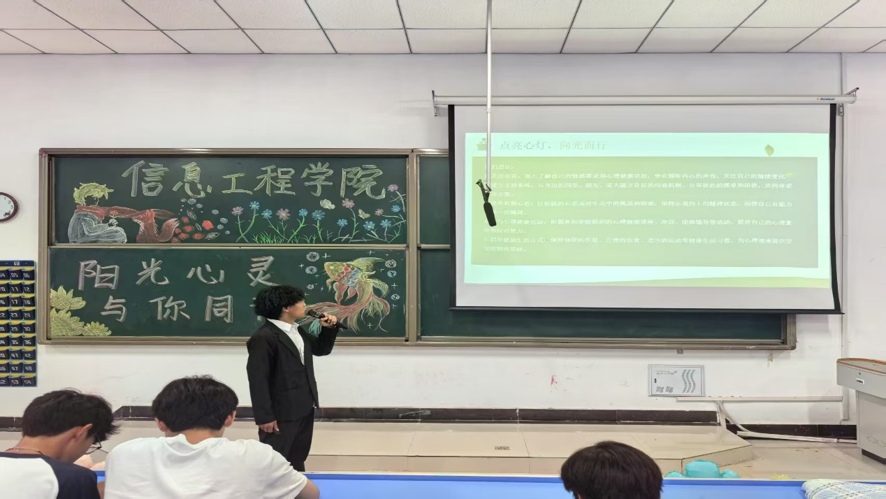 本网讯(通讯员 闫俞彤)为提升学生心理健康素养,营造积极向上的校园氛围,信息工程学院于5月22日晚在教学楼5205教室举办“阳光心灵,与你同行”525心理活动。本次活动由杨正伟主持。