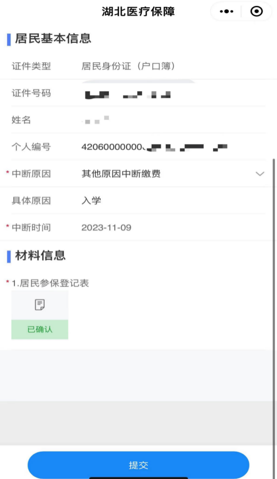 3、确认并提交,再次核对个人信息后,点击“提交”,参保暂停业务完成。