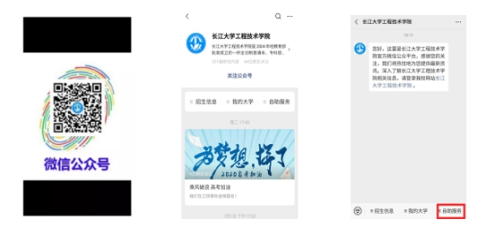 扫描下方二维码关注微信公众号“长江大学工程技术学院”,关注后,点击右下方菜单“自助服务”,进入缴费界面。